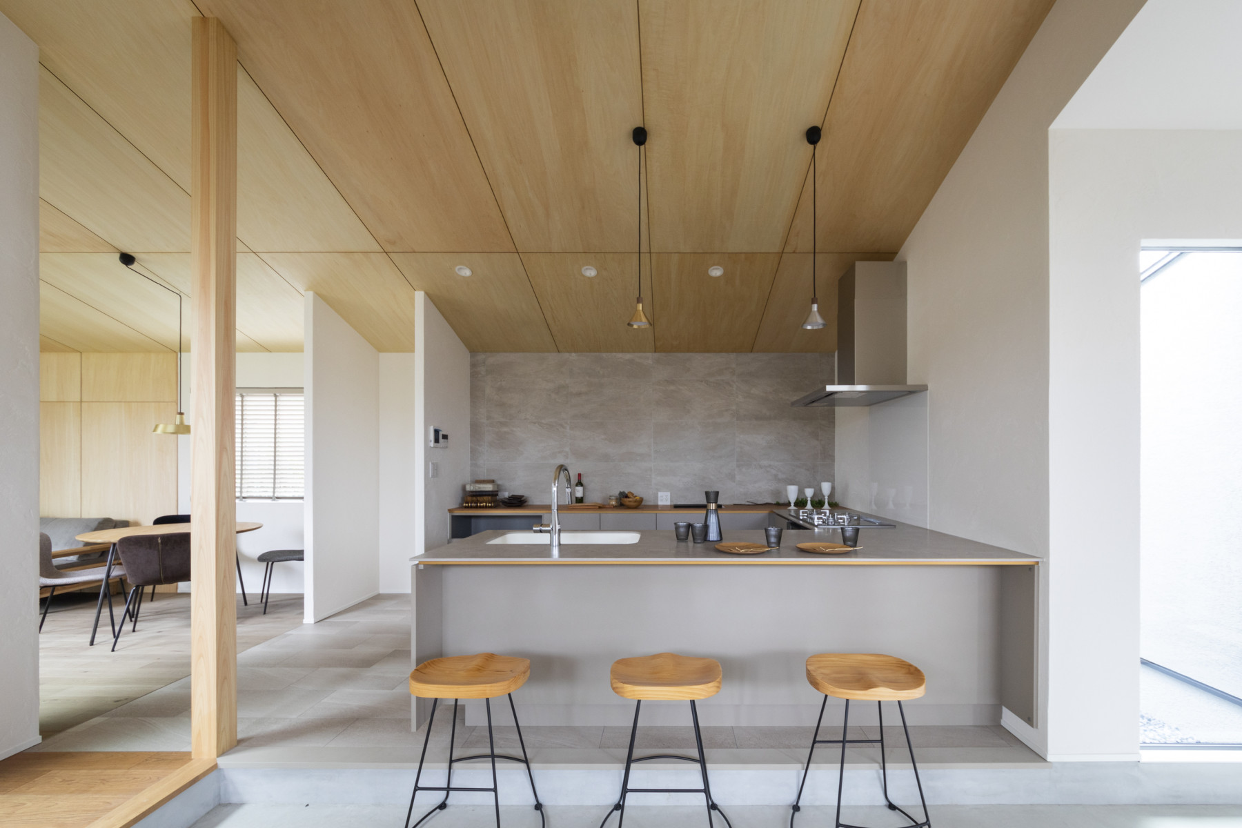 コの字で囲われた勾配天井の家