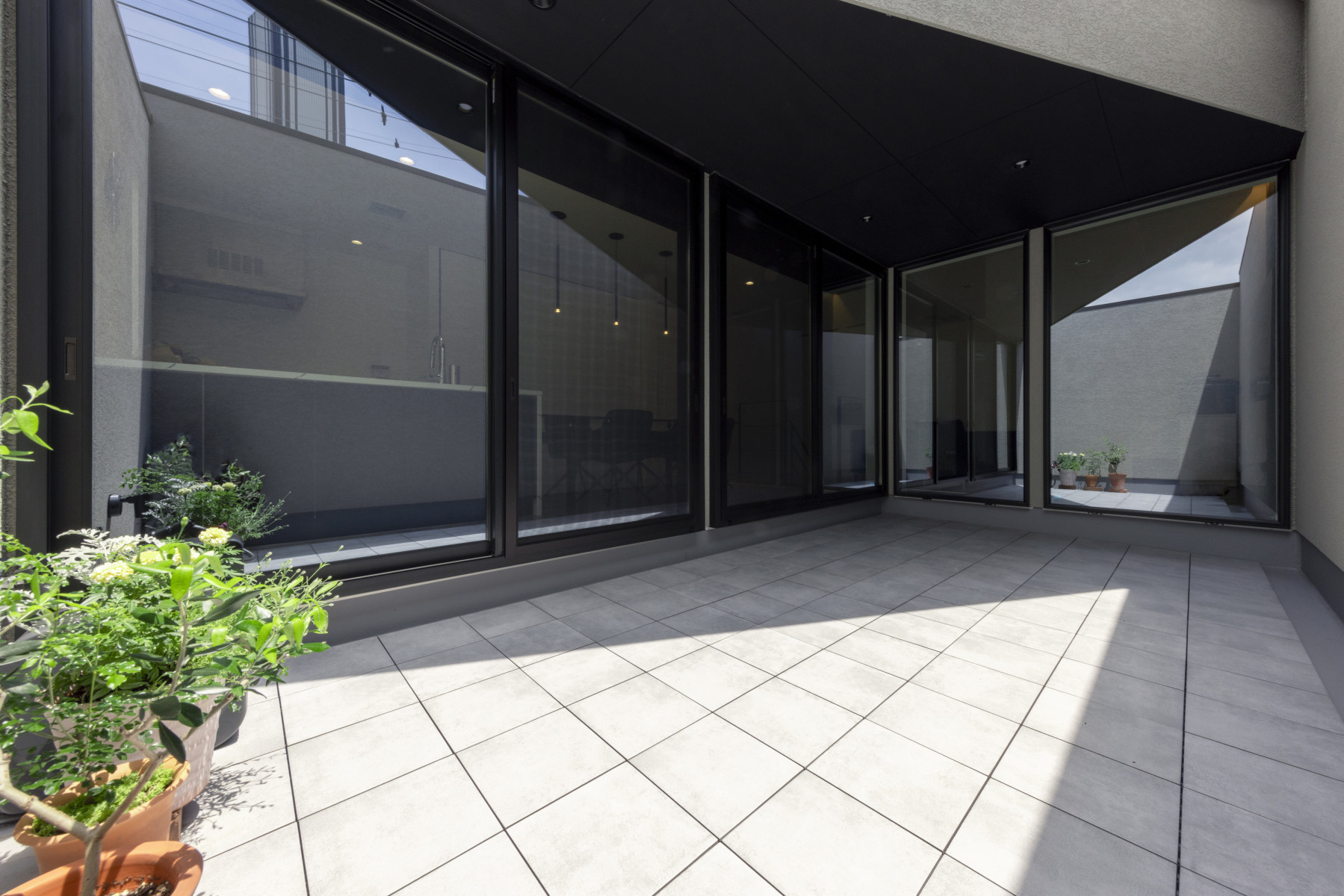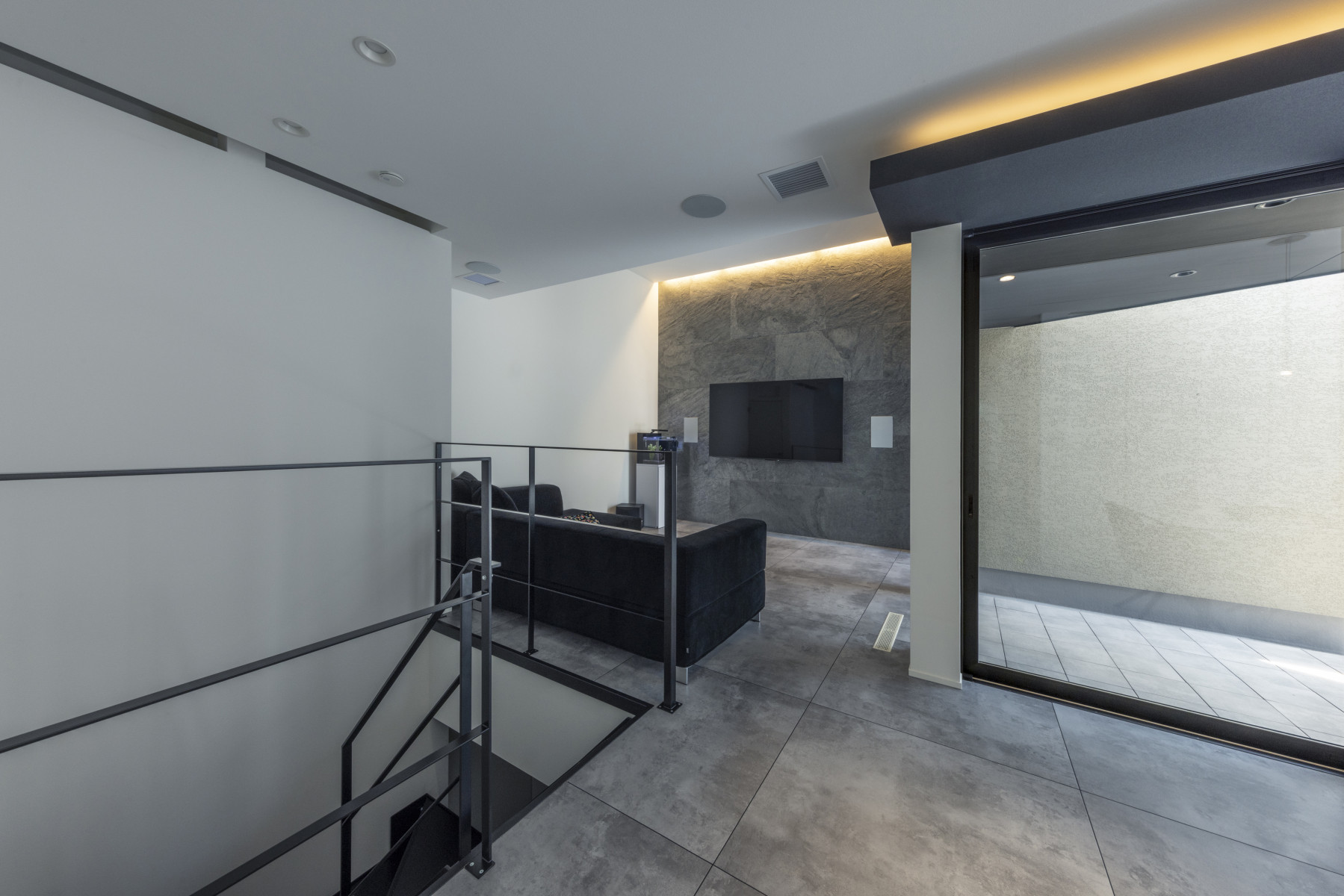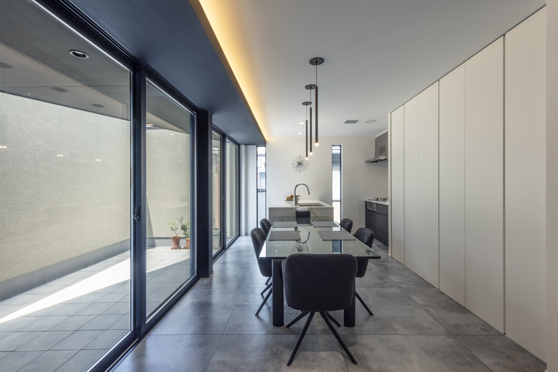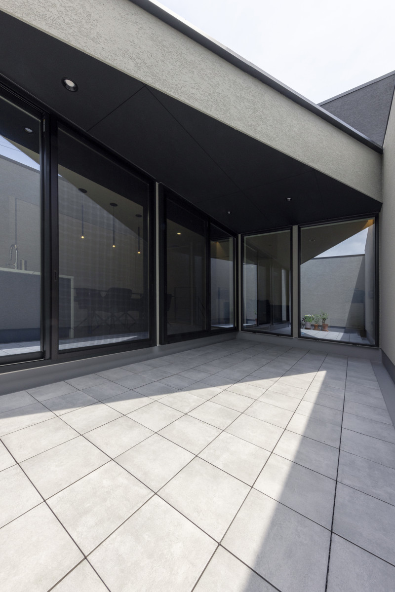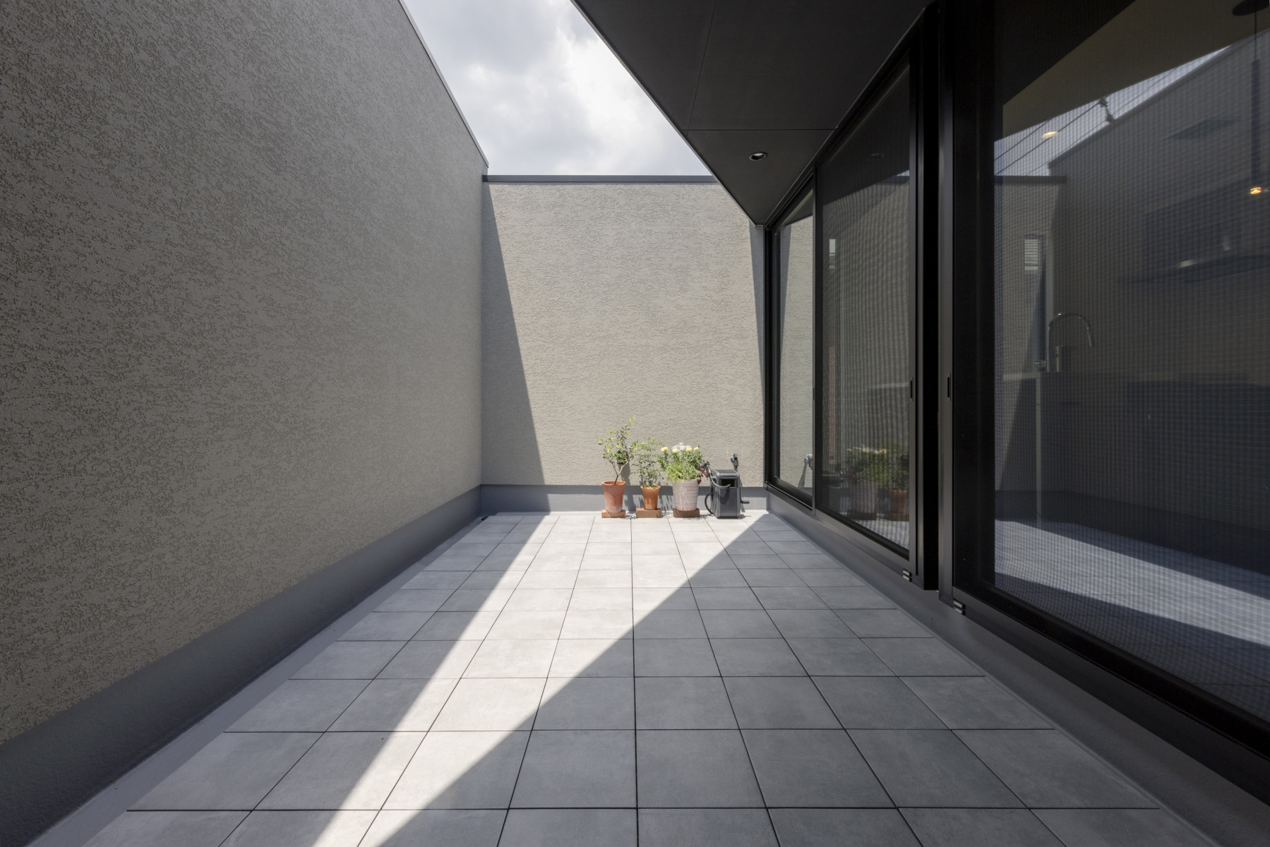 愛知県岡崎市にたつこの住宅は、岐阜のような広い敷地環境とは違う限られた住宅街の敷地に、インナーガレージを取り込みつつ、いかに開放的なリビングや外部環境を創出するかが課題であった。近隣住宅が近く準防火地域であるこの敷地においては、開放的な開口部とプライバシーの確保が同義である建物の構成が求められた。インナーガレージの上部に配置したアウターリビングを目隠し壁で覆うことで、遮炎壁として機能させ開口部の開放性を確保しながら、同時に積極的にひらける場所を用意した。またの目隠し壁が外観のアクセントポイントとして機能することを意図している。