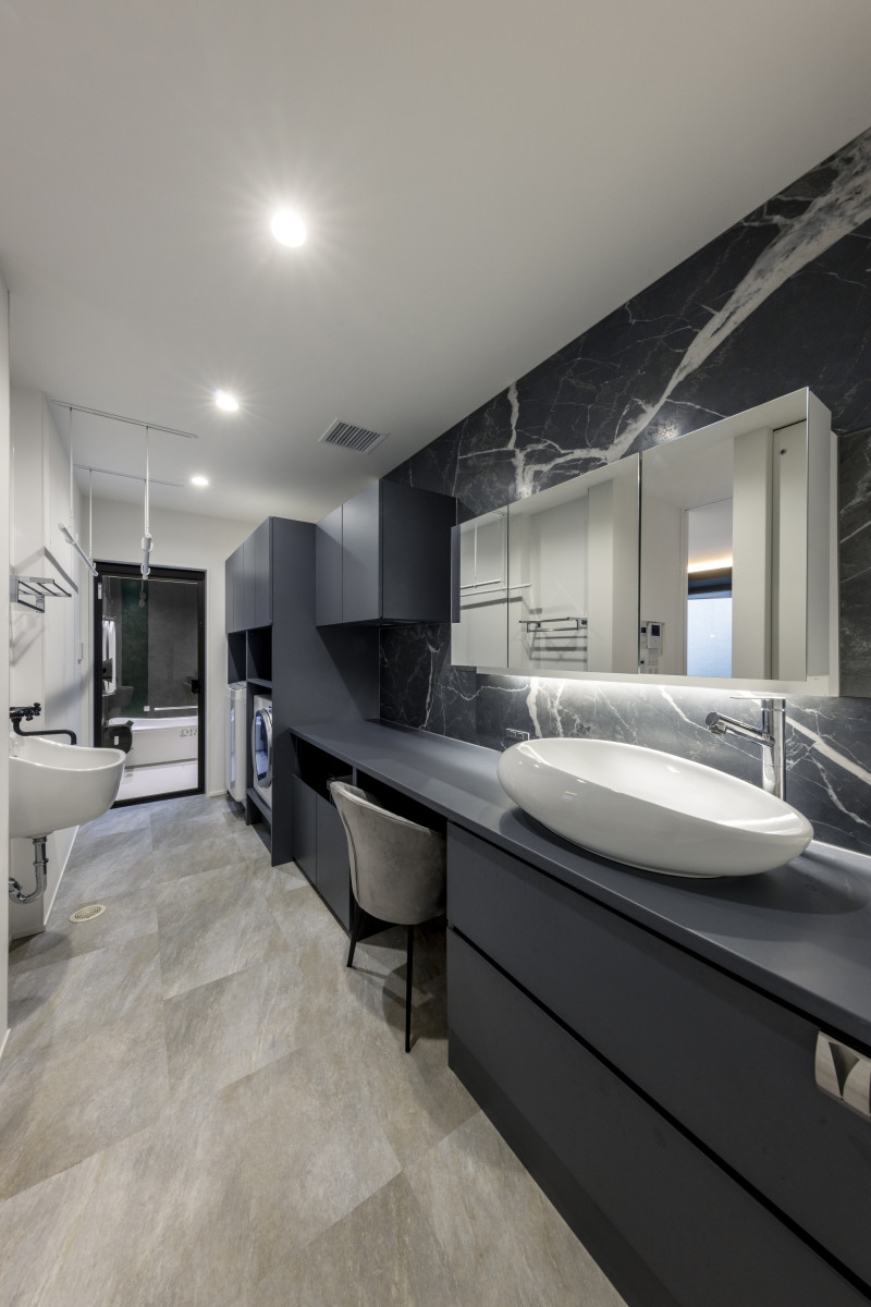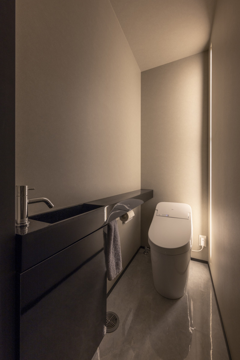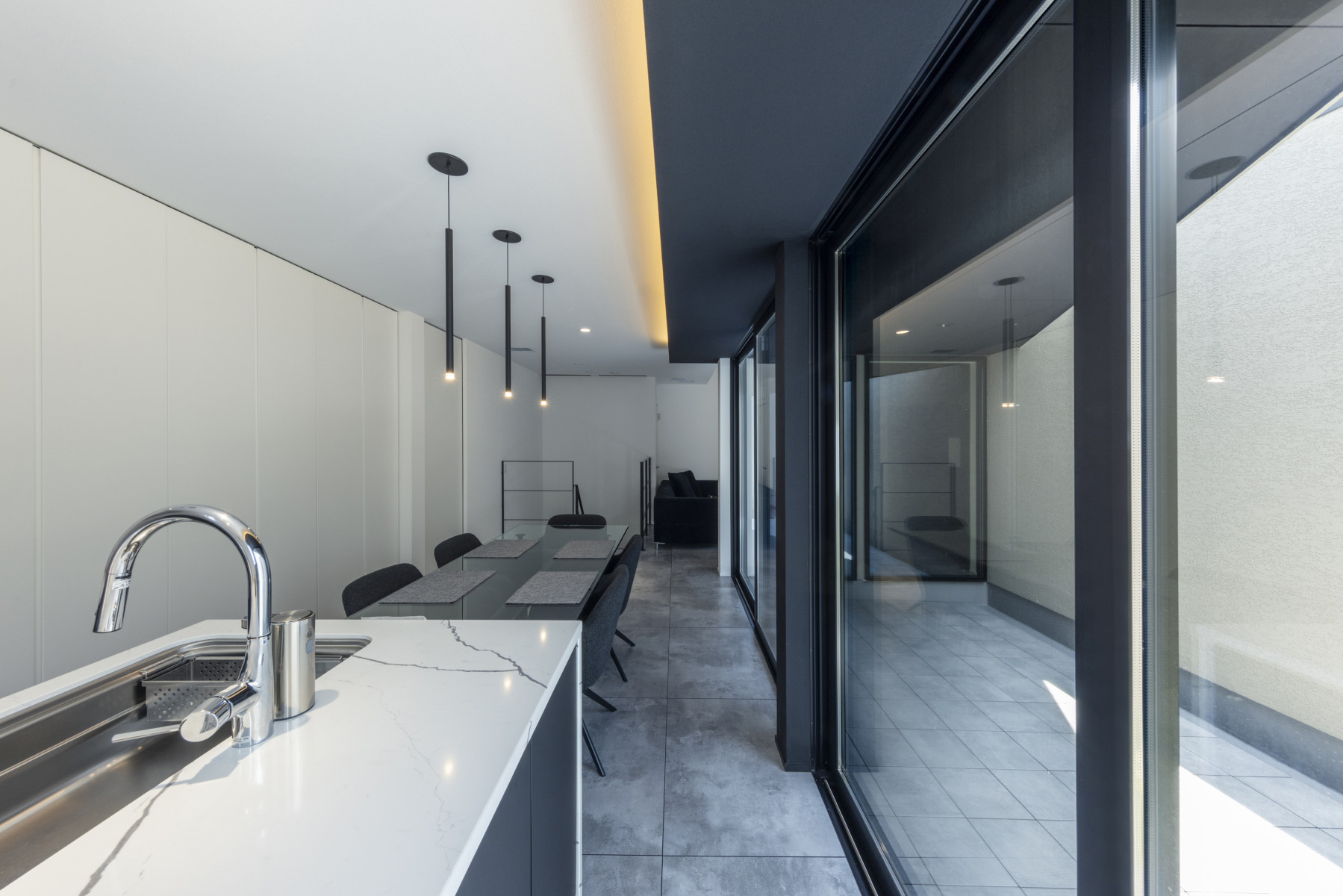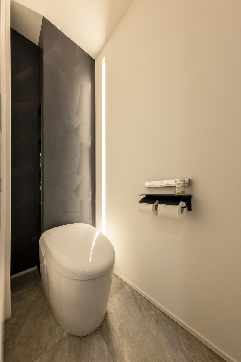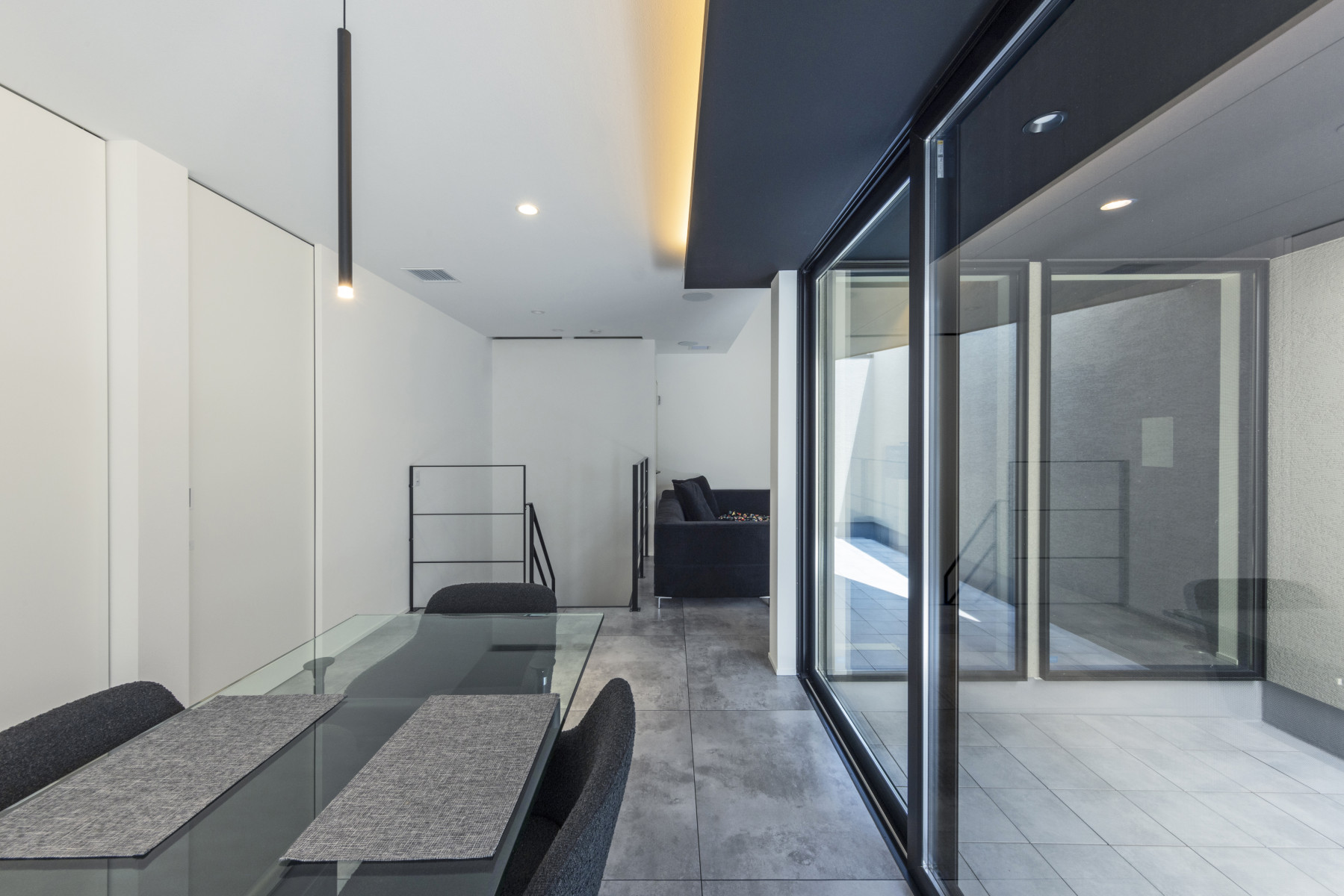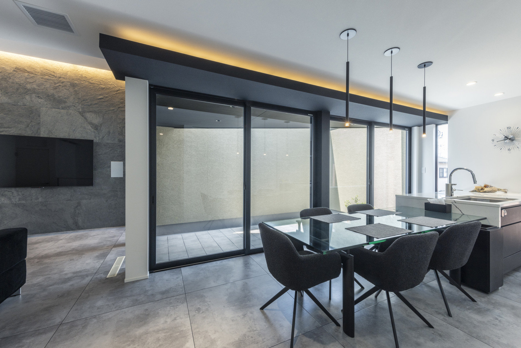 愛知県岡崎市にたつこの住宅は、岐阜のような広い敷地環境とは違う限られた住宅街の敷地に、インナーガレージを取り込みつつ、いかに開放的なリビングや外部環境を創出するかが課題であった。近隣住宅が近く準防火地域であるこの敷地においては、開放的な開口部とプライバシーの確保が同義である建物の構成が求められた。インナーガレージの上部に配置したアウターリビングを目隠し壁で覆うことで、遮炎壁として機能させ開口部の開放性を確保しながら、同時に積極的にひらける場所を用意した。またの目隠し壁が外観のアクセントポイントとして機能することを意図している。