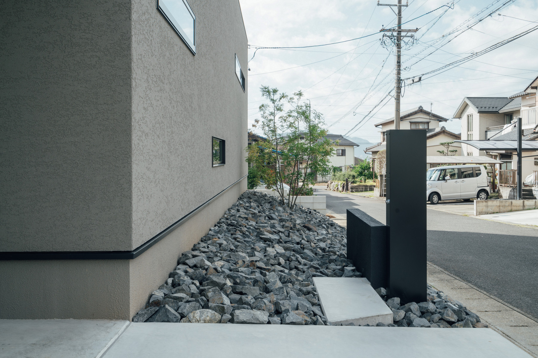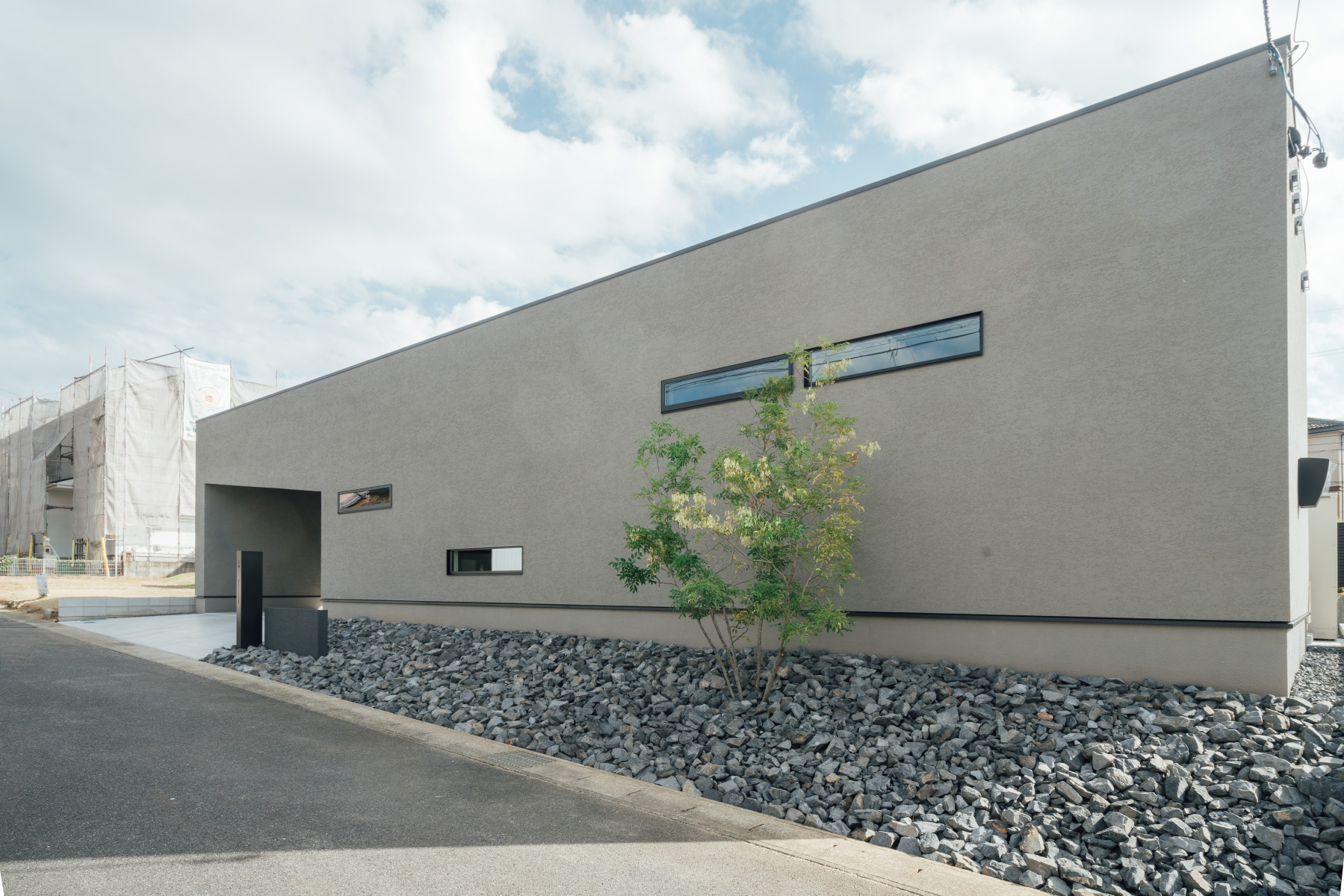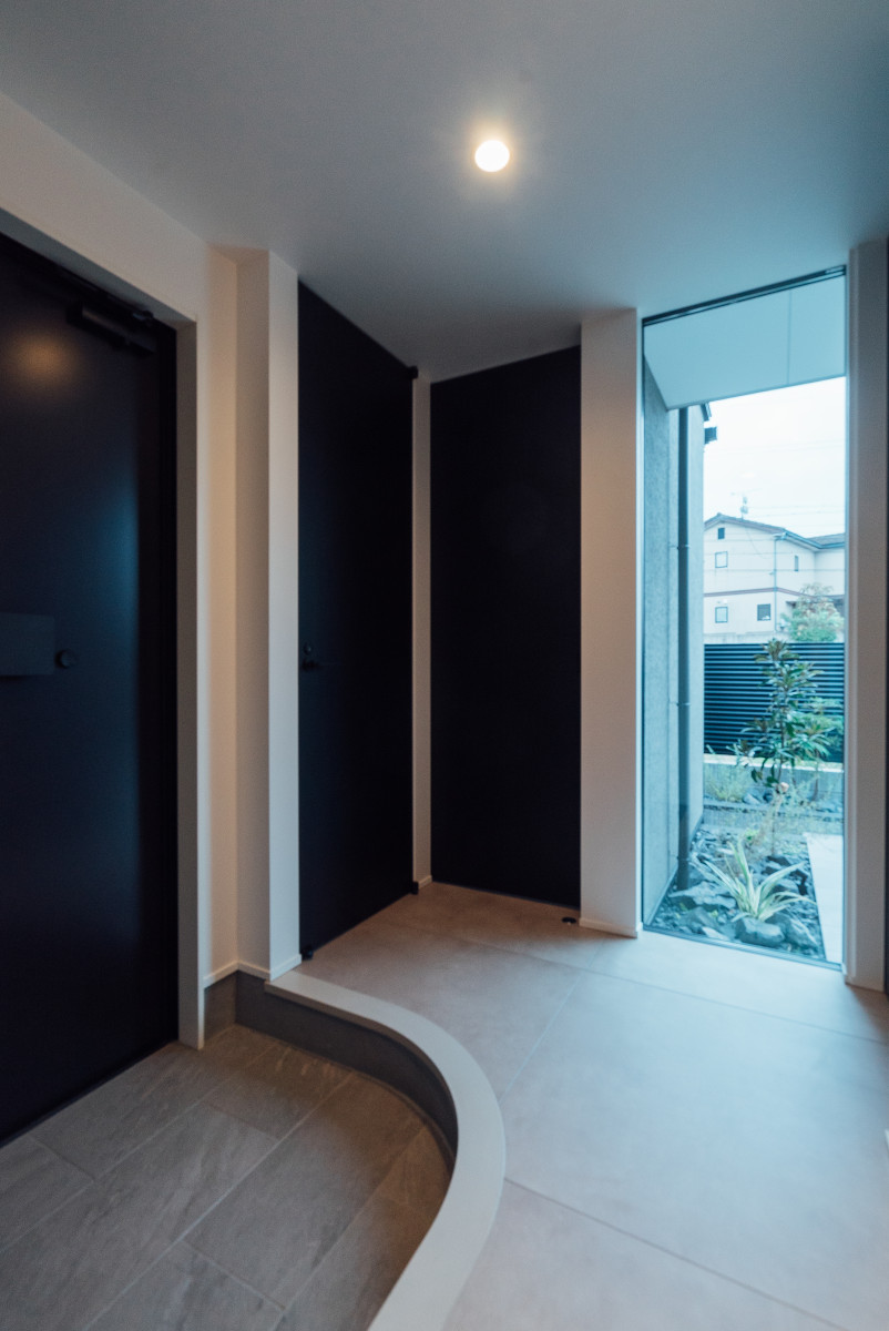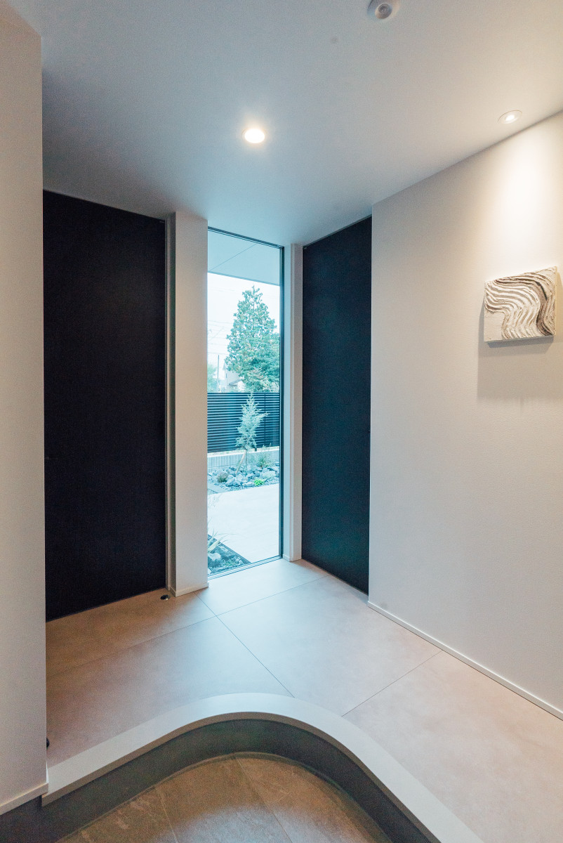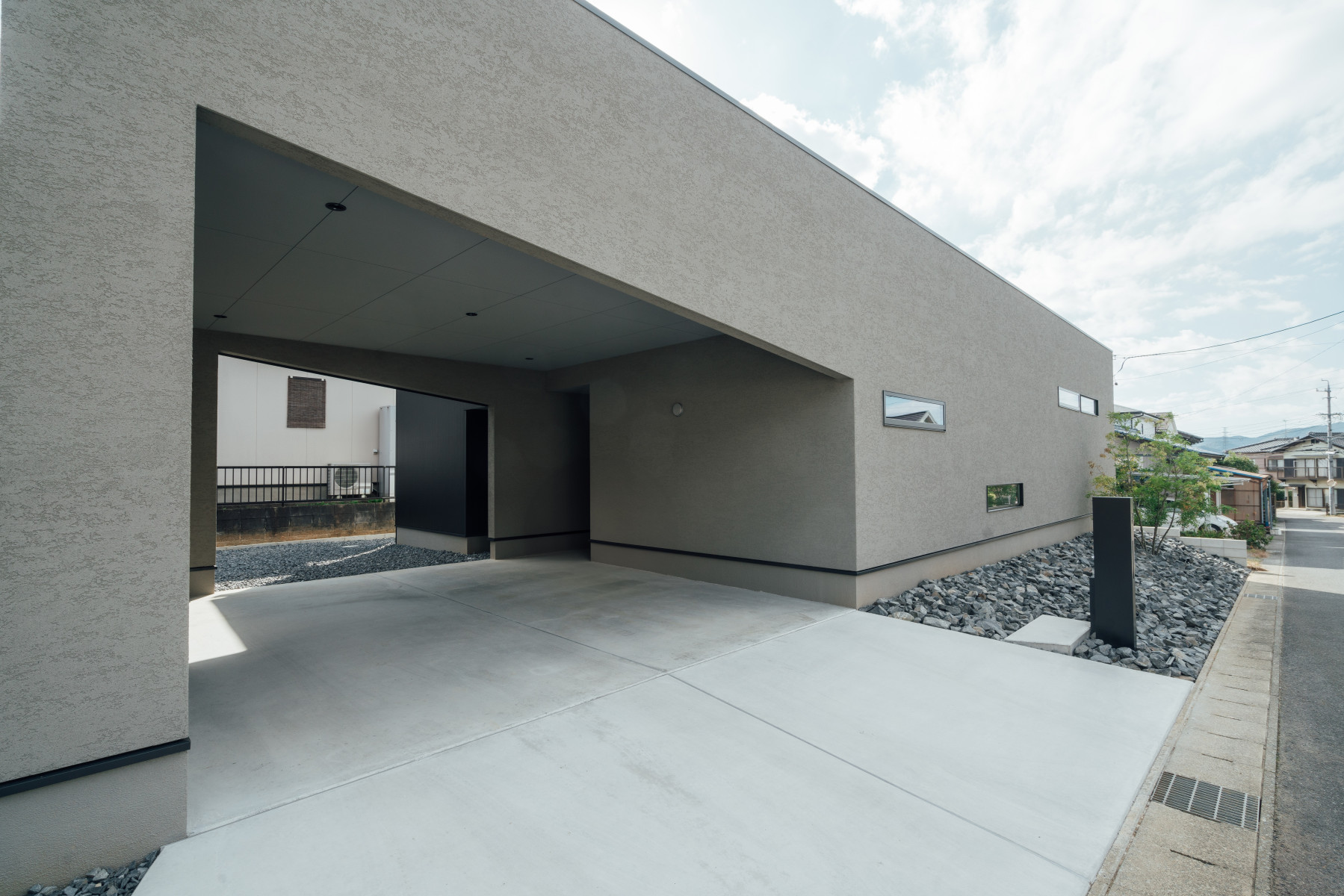 間口の広い敷地形状を活かし、オープンガレージも含めて一体的な一つの壁面で外観をまとめることで、無駄な要素のないシンプルかつ存在感のあるファサードとした。また、敷地に対し全面道路が傾斜しておりそのレベル差を法面で仕上げることで、建物の佇まいにアクセントを与えた。正面は北側で周辺の住宅の視線もあり、極力閉じ、コの字型の平面形状とすることで南側に庭を確保し、積極的に開ける環境を構築した。