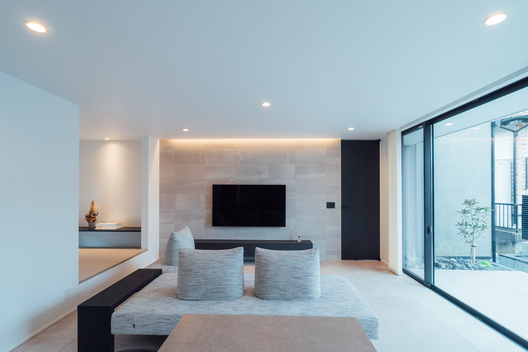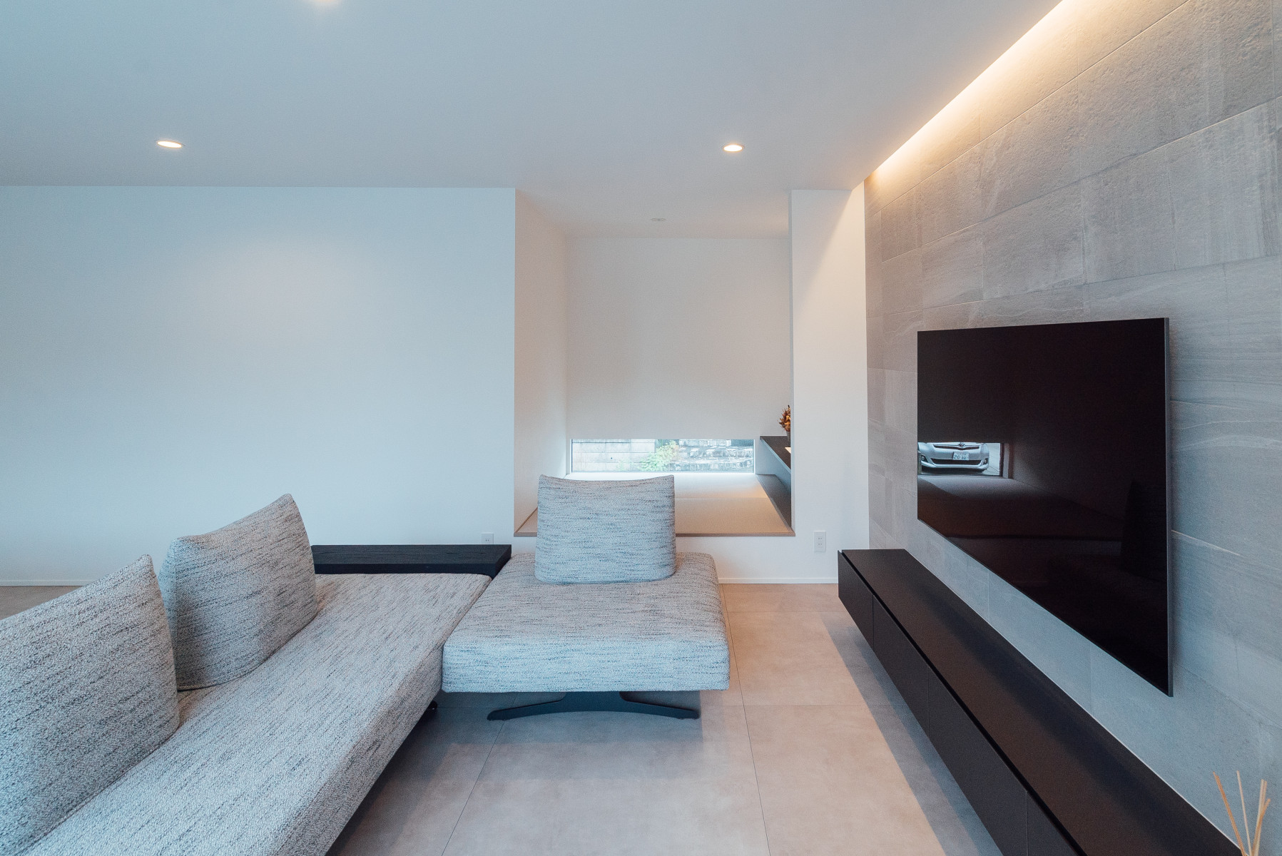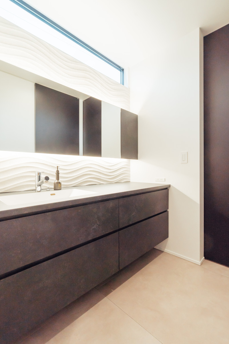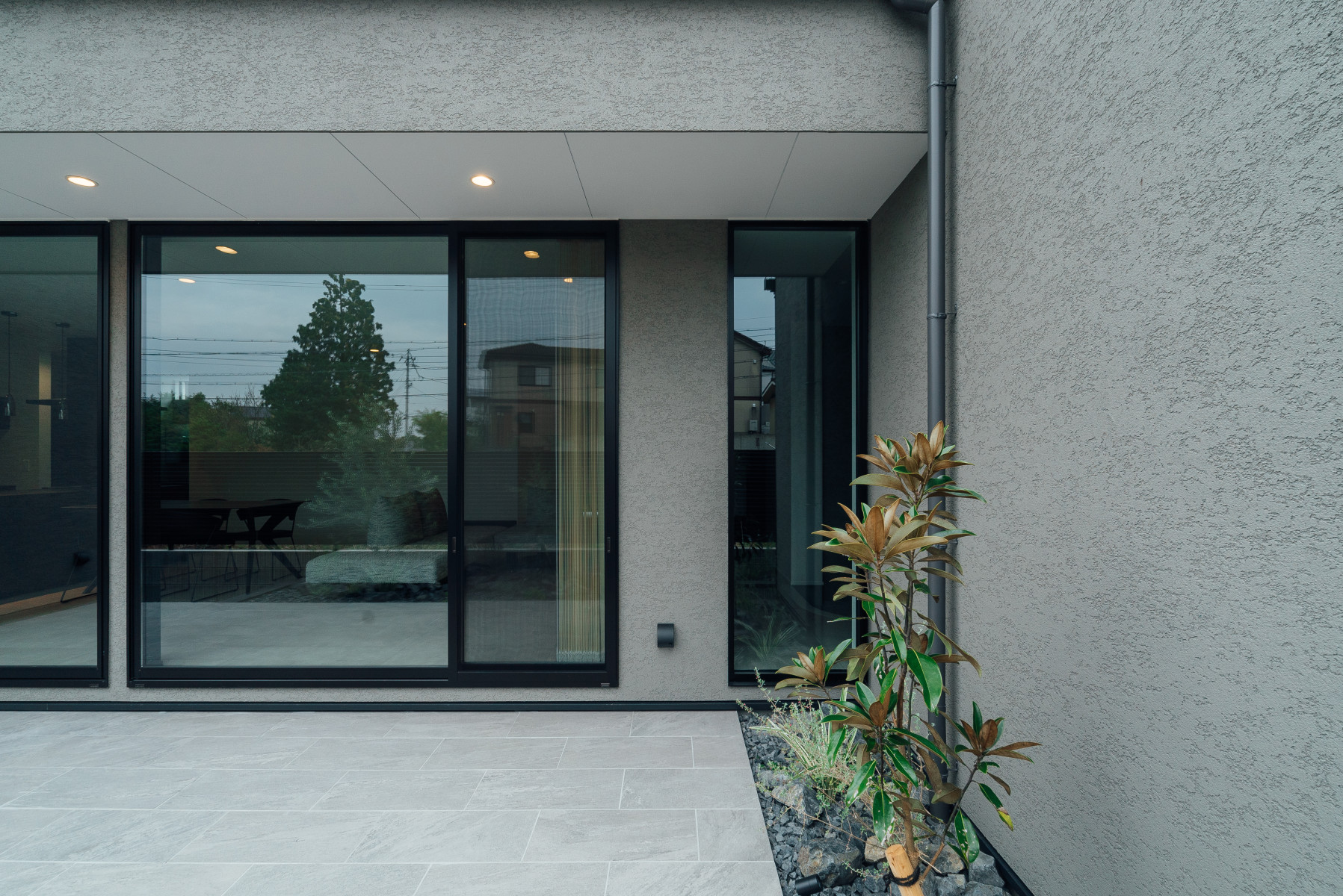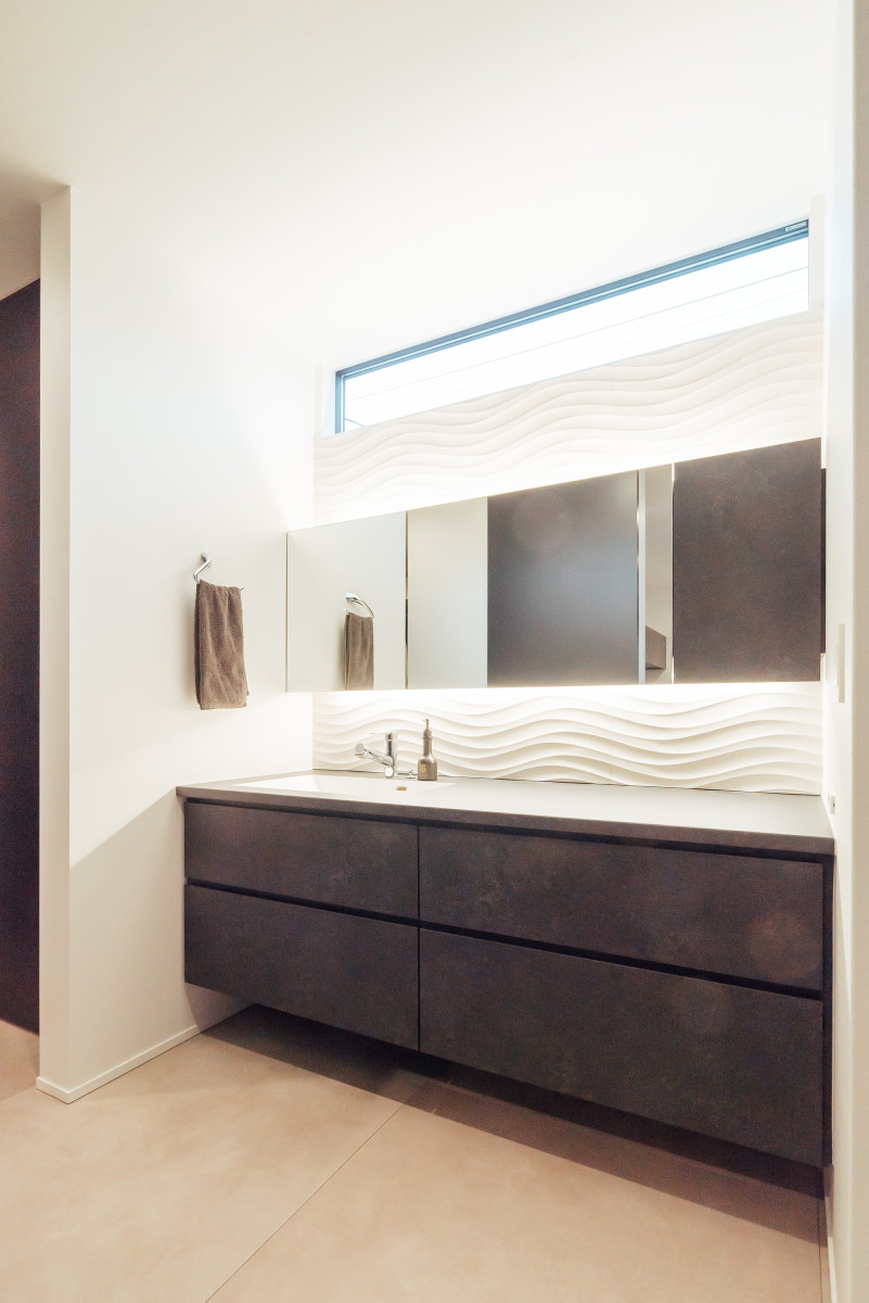 間口の広い敷地形状を活かし、オープンガレージも含めて一体的な一つの壁面で外観をまとめることで、無駄な要素のないシンプルかつ存在感のあるファサードとした。また、敷地に対し全面道路が傾斜しておりそのレベル差を法面で仕上げることで、建物の佇まいにアクセントを与えた。正面は北側で周辺の住宅の視線もあり、極力閉じ、コの字型の平面形状とすることで南側に庭を確保し、積極的に開ける環境を構築した。