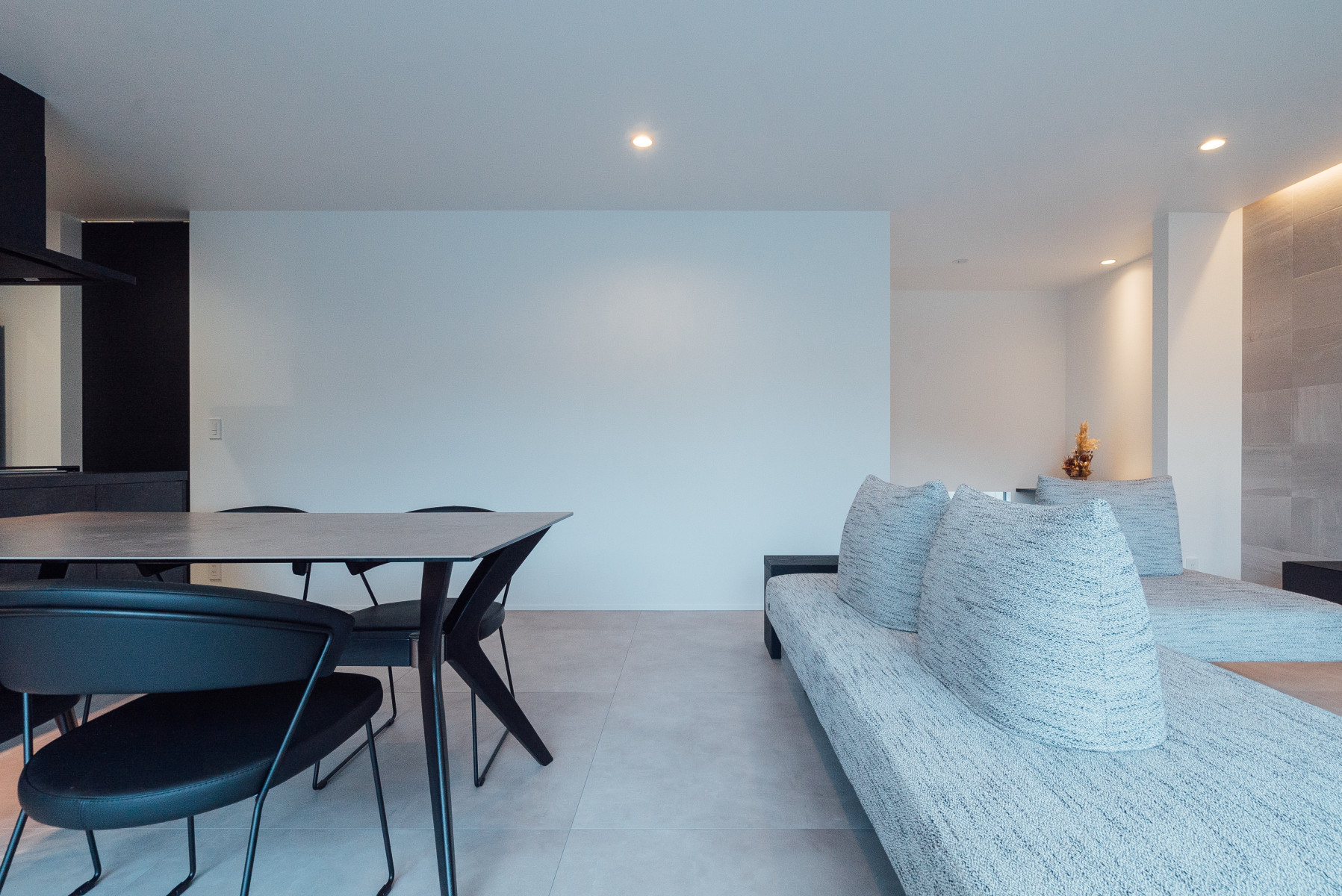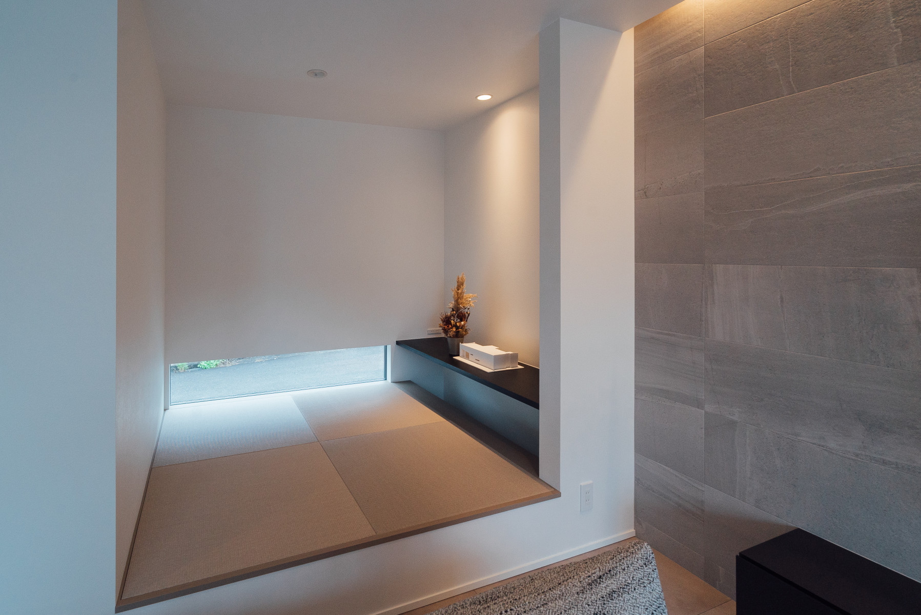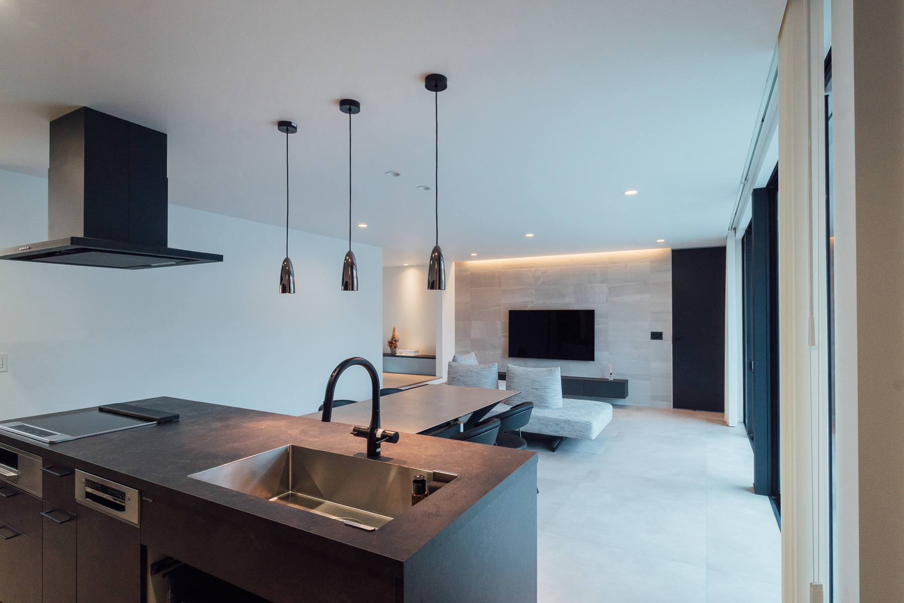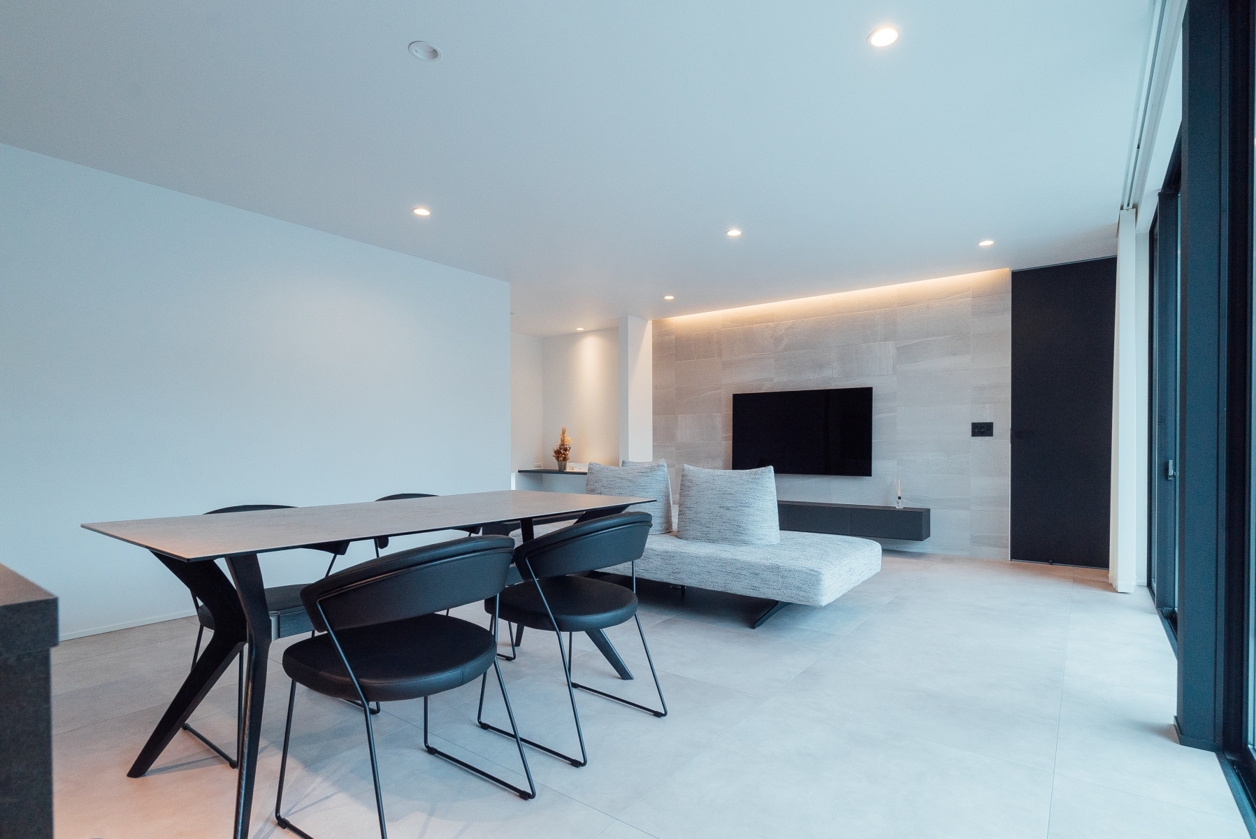 間口の広い敷地形状を活かし、オープンガレージも含めて一体的な一つの壁面で外観をまとめることで、無駄な要素のないシンプルかつ存在感のあるファサードとした。また、敷地に対し全面道路が傾斜しておりそのレベル差を法面で仕上げることで、建物の佇まいにアクセントを与えた。正面は北側で周辺の住宅の視線もあり、極力閉じ、コの字型の平面形状とすることで南側に庭を確保し、積極的に開ける環境を構築した。