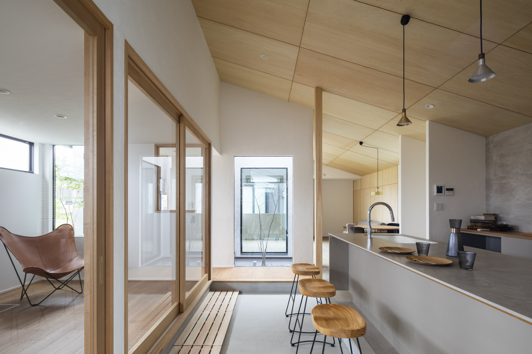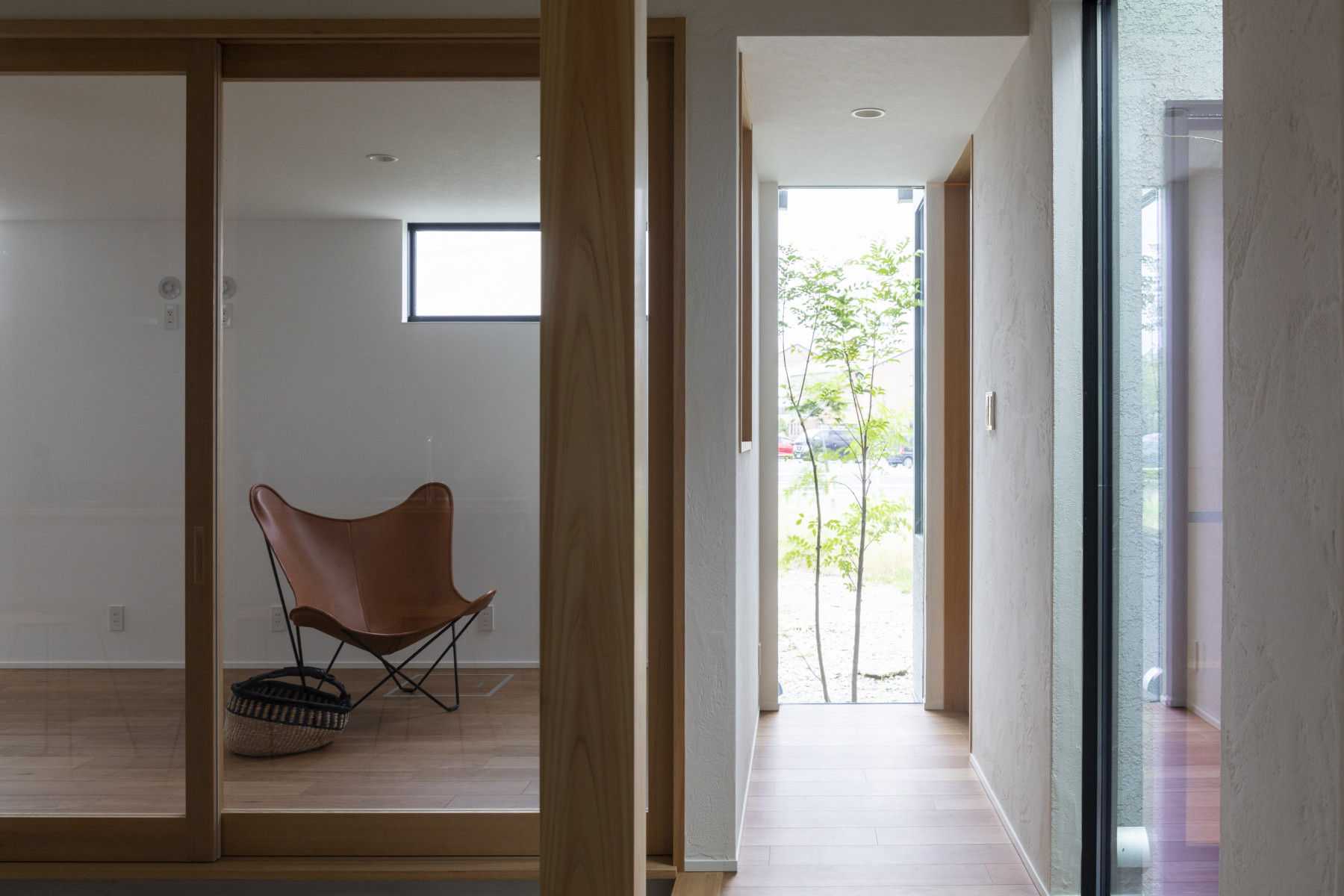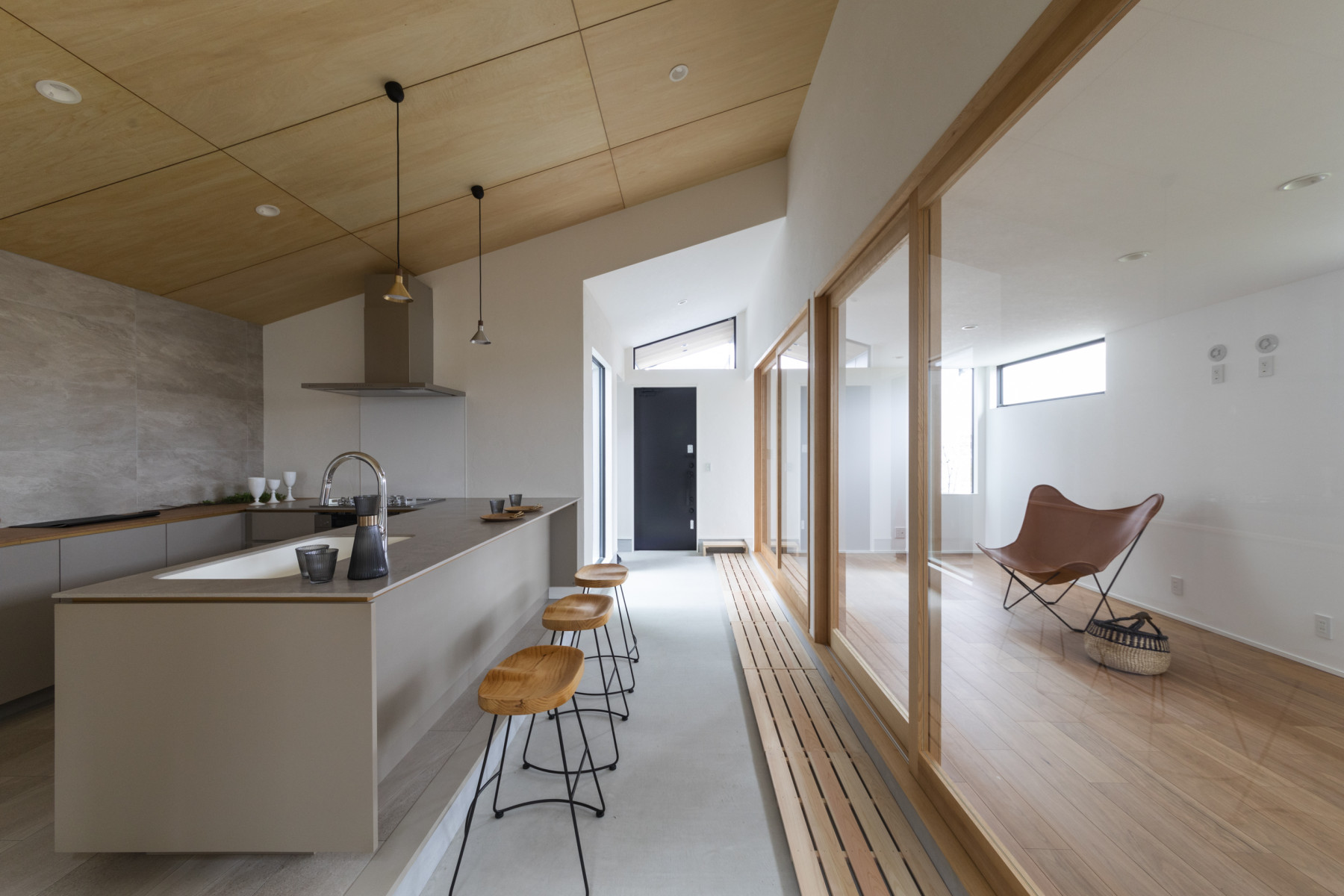 玄関を開けると「ドマ」空間が広がる住宅。この住宅における「ドマ」=「生活の余白」。分譲型モデルハウスとして建てられたこの住宅は、住み手によって、また生活者の成長によって変化拡張していく住宅を目指した。ドマは、そのままキッチンやガラス張りの個室と連続し、その様相が変化する。部屋に名前をつけることで、そこでの行為が制約されている現代の住宅にはない、余白のある自由度の高い空間になっている。