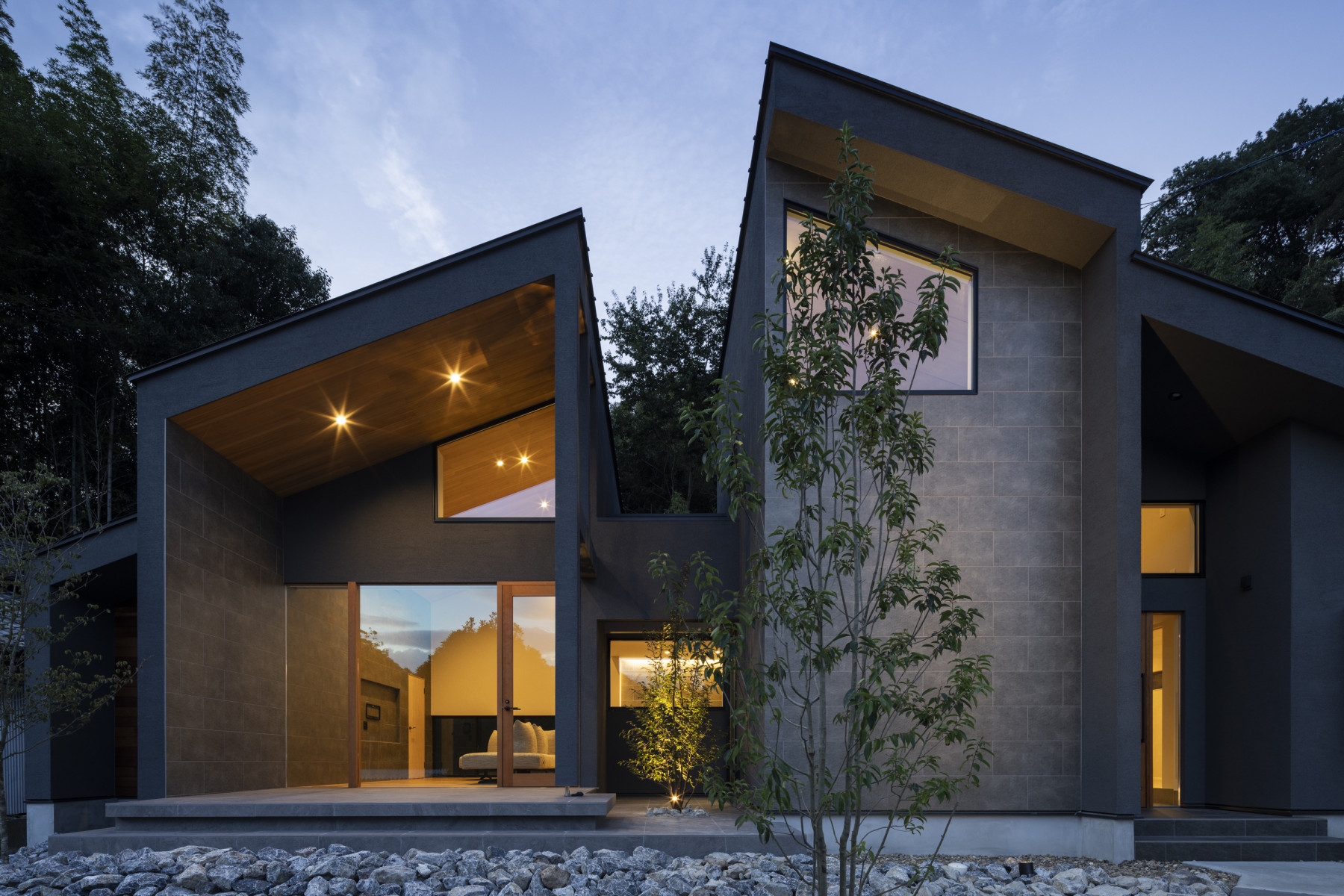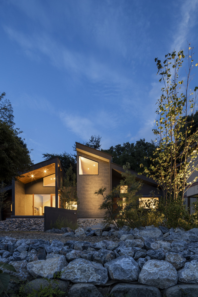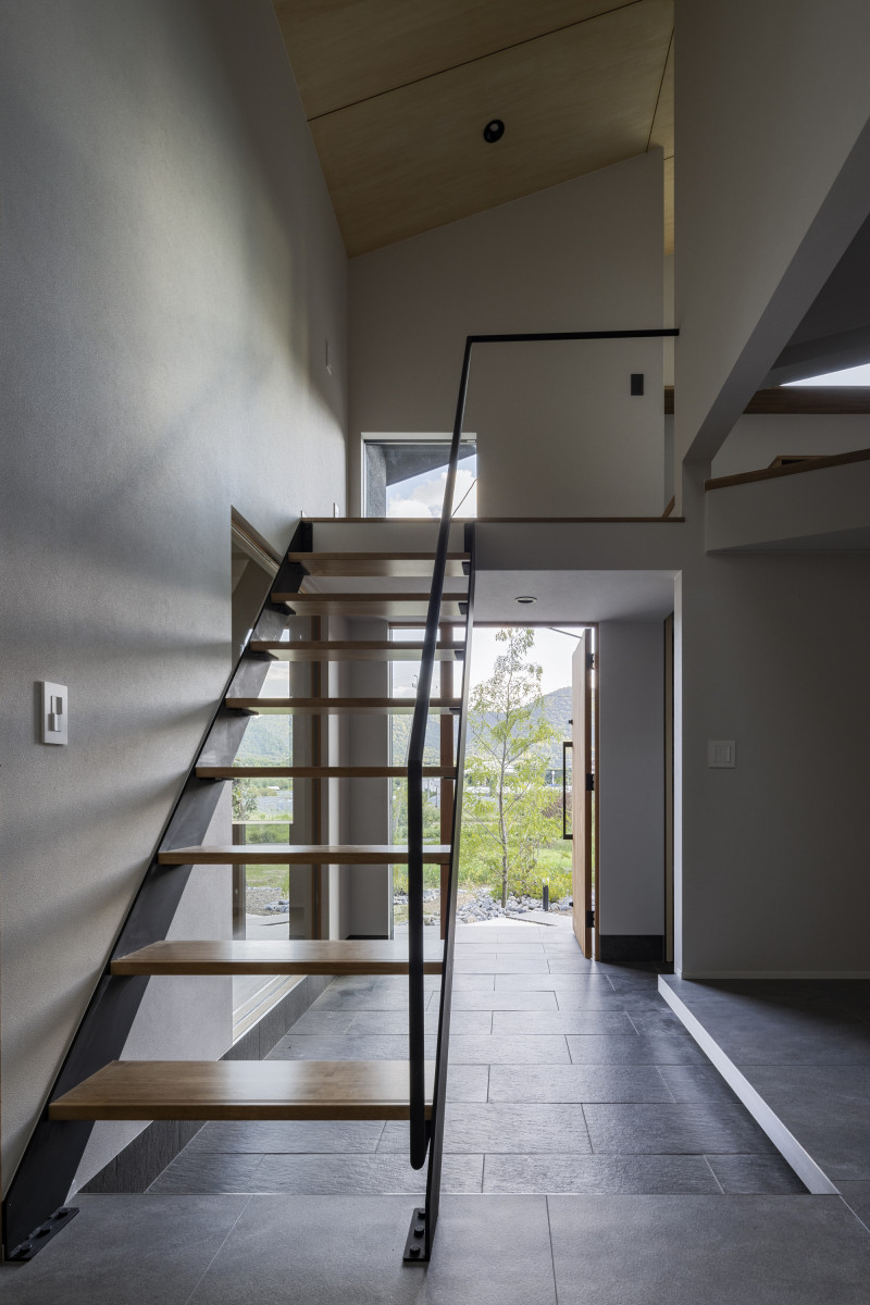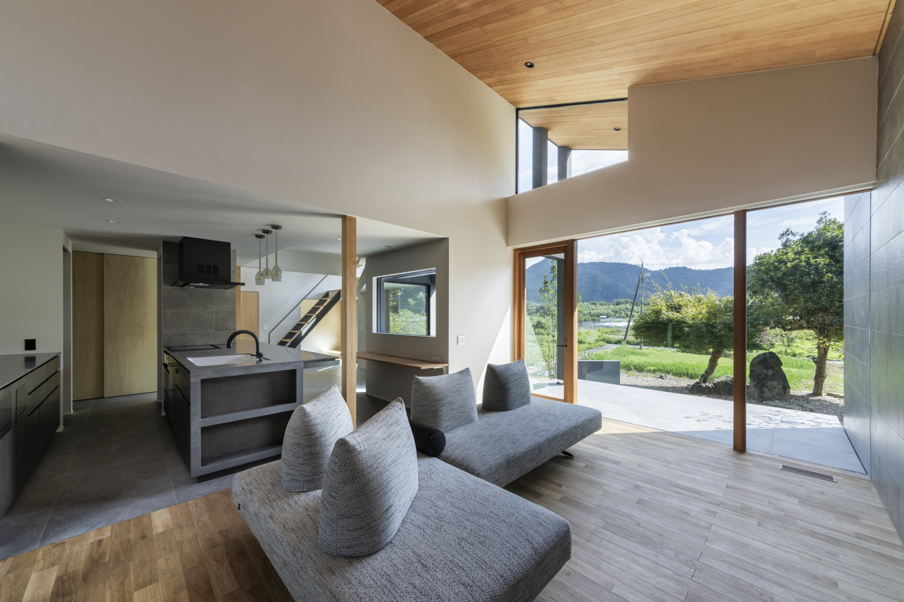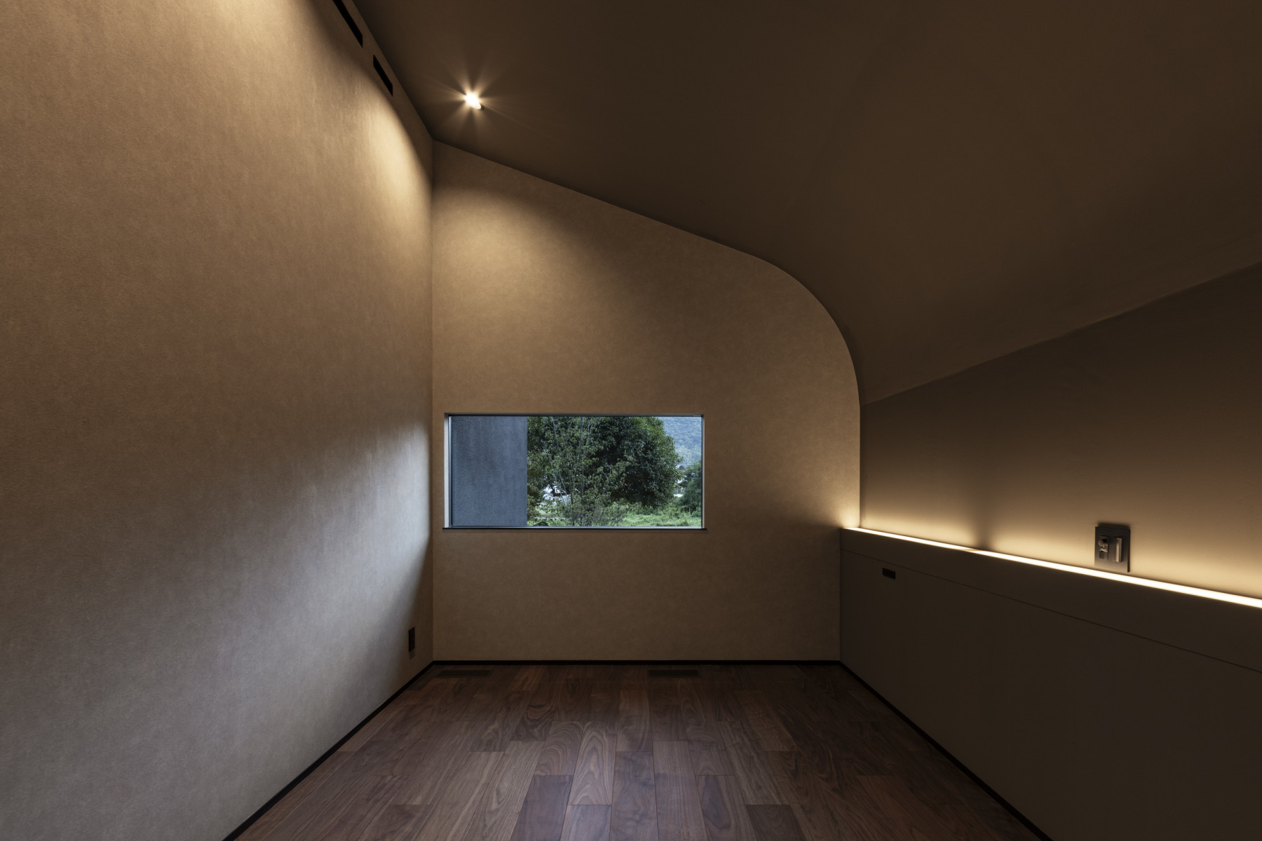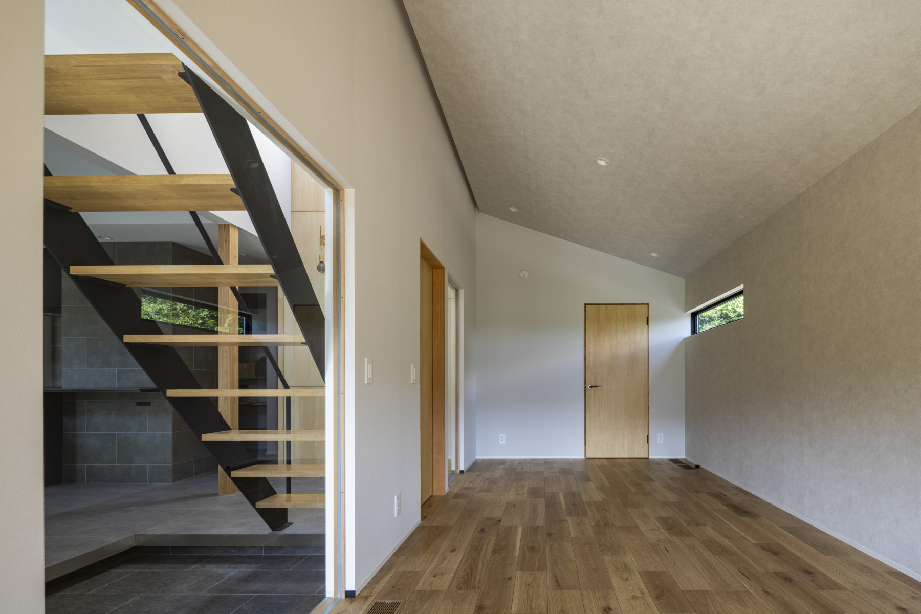 雄大な自然の中に溶け込むように佇む建築家の自邸。弊社のモデルハウス兼オフィスとしても位置付け、多様な体験が可能です。内部機能を基に断面的に構成された必要ボリュームが外観を形作り、深い庇を兼ねた各フレーム毎に素材を使い分けることでその陰影によりファサードを形成しています。弊社のモデルハウスとなるここでは、光、温度環境、音、設備、全ての実体験が可能になります。日本中に蔓延る「多大な性能」と「一律な機能」だけに特化した住宅ではなく、一見無駄にみえる余白や開口をもつ、多様なアクティビティを許容する空間づくりをしています。実験的な全館空調、ガラス張りの子ども部屋、緩急のある天井高さ・・・まずは実際に御体験ください。