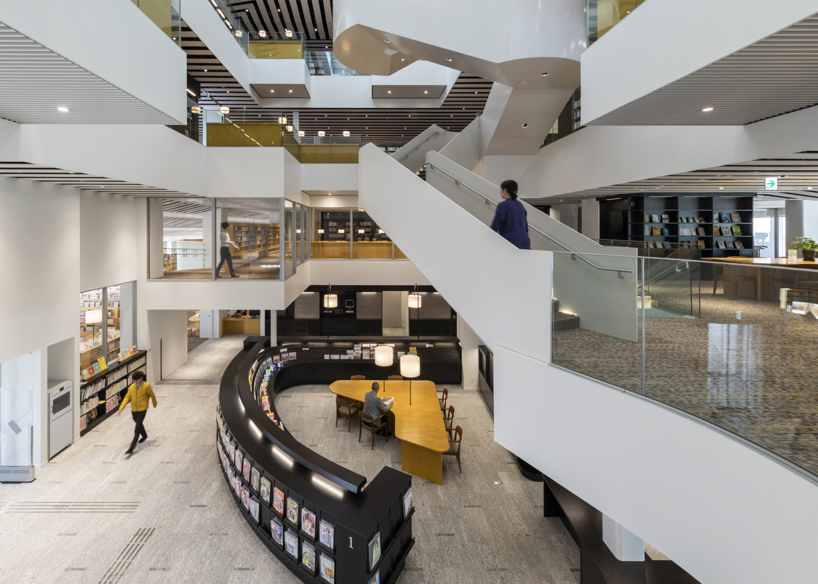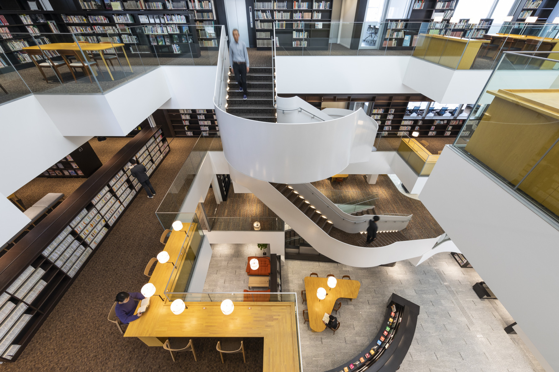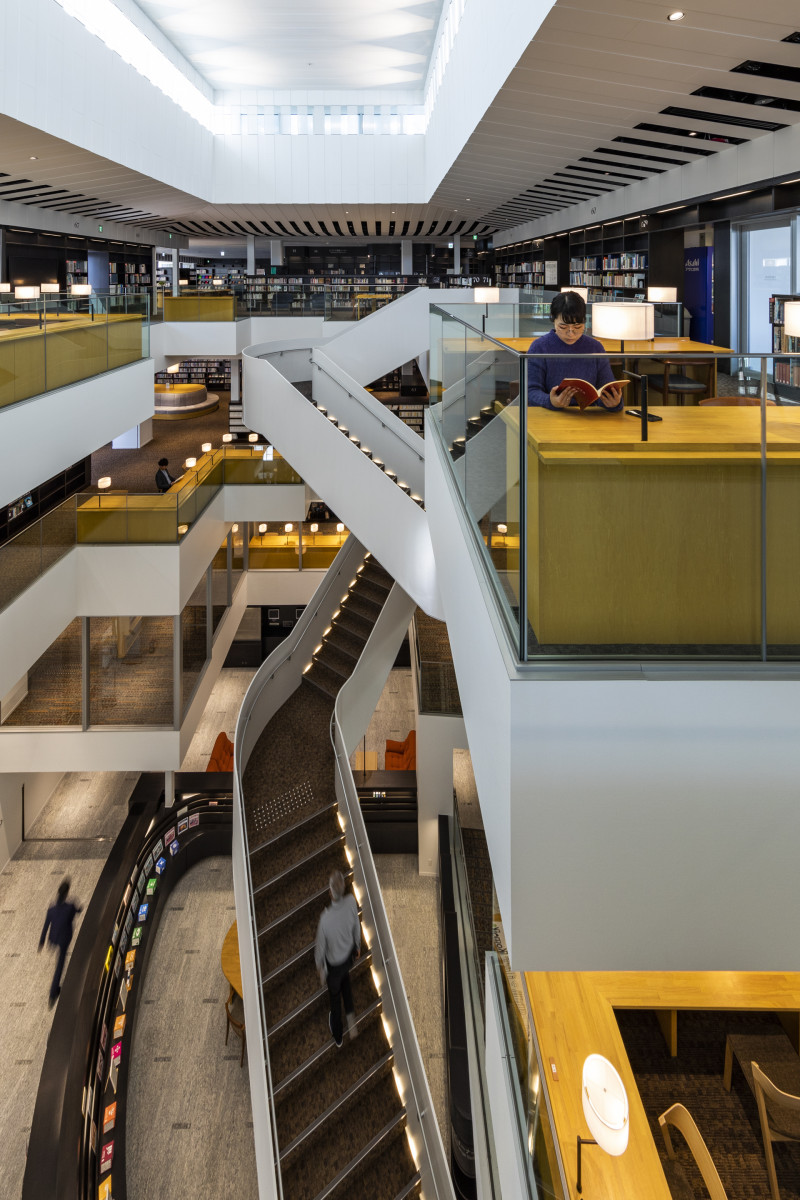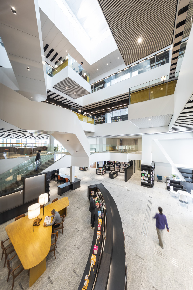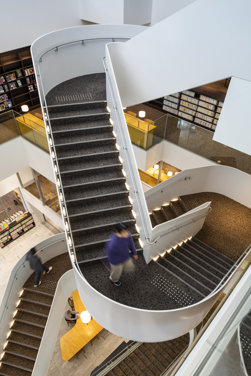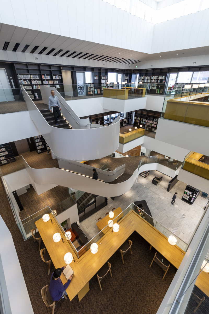 一見複雑な空間に感じるが、明快な構成とし各エリアにそれぞれの特性を与えることで、多様な居場所を創出しながらも、図書館としての機能性を確保している。この図書館は見る角度や方向によって多様な視線の抜けが突如として現れ、複雑なシーンが連続する。本との出会いを楽しみながら散策できる場所となっている。ハイサイドライトからの自然光に満たされた吹抜から見下ろすと、館内の約700の席で各々が自由に過ごす様子が、同時多発的に垣間見え、実に多様性に富んだ居場所となっている。またBDSのセキュリティラインを最大限に拡張し、バルコニーテラスも含めて館内全域に本を持ち出せるのも特徴である。