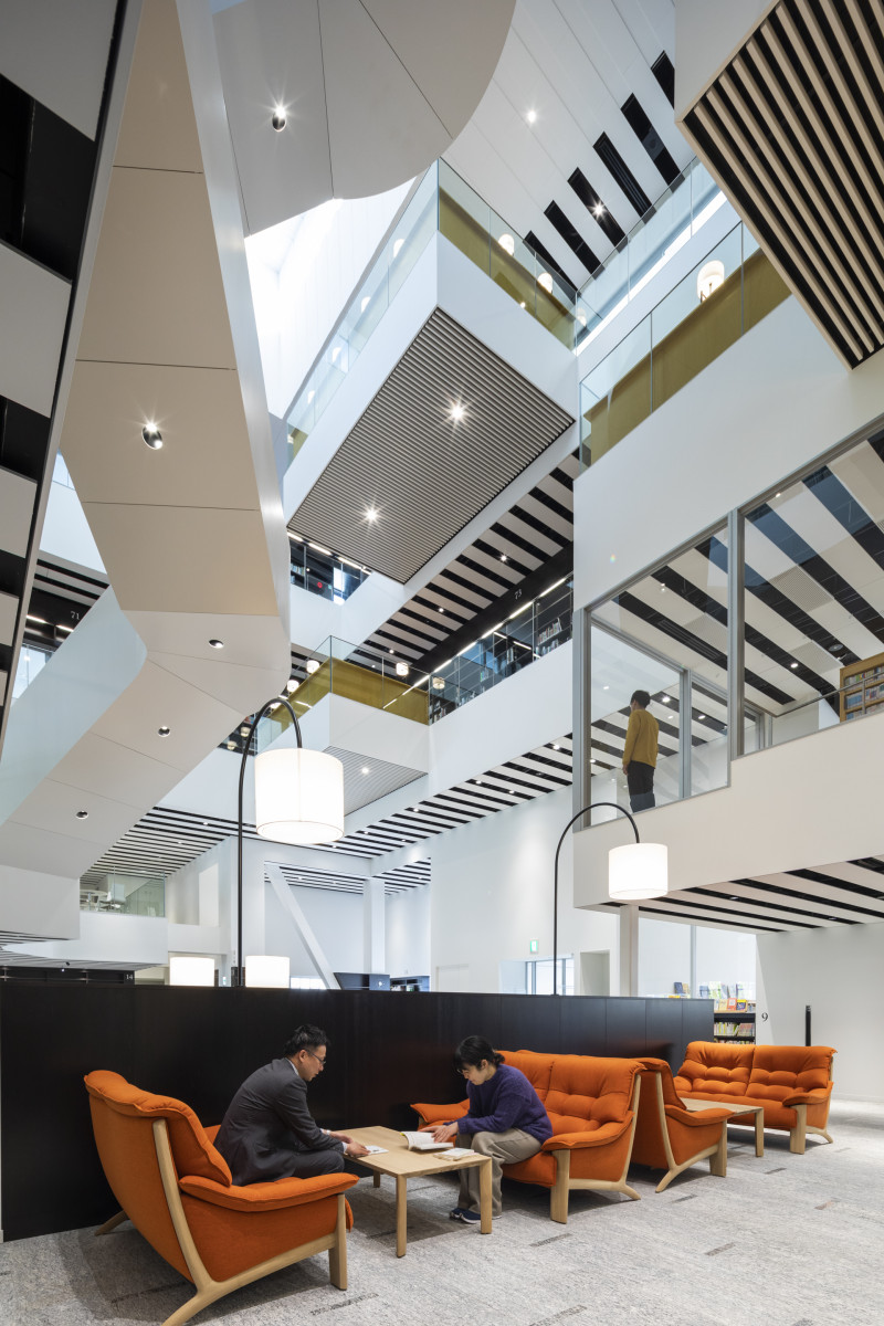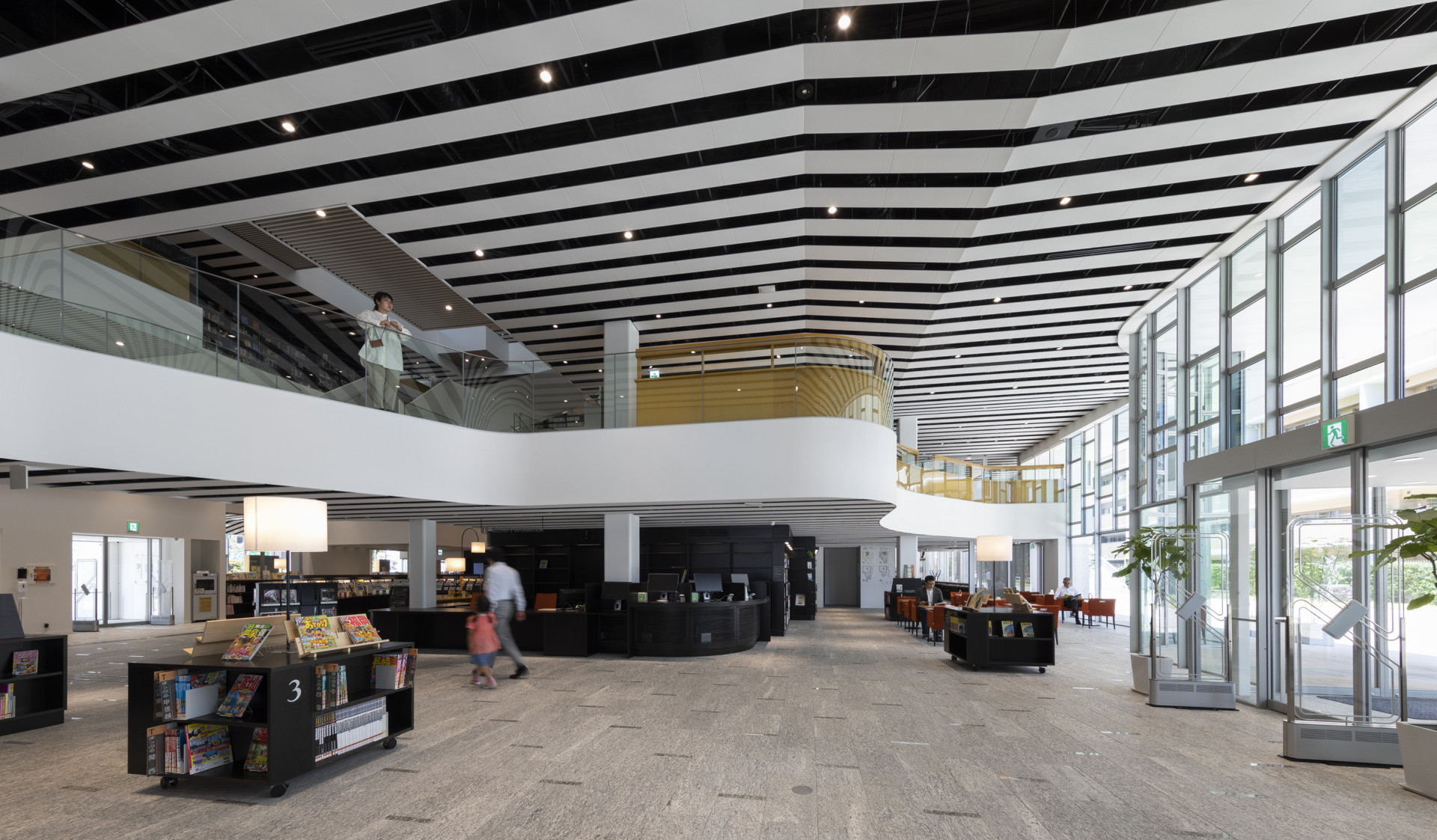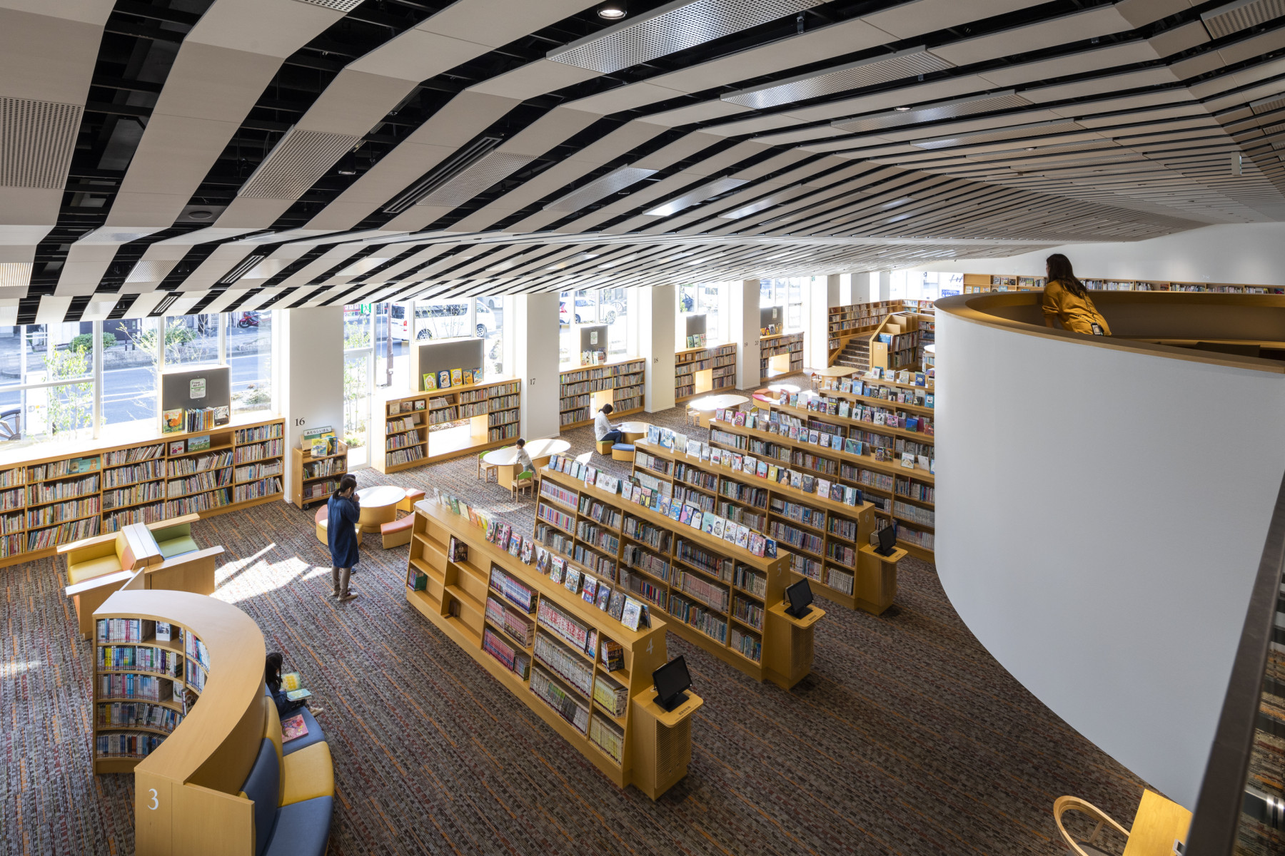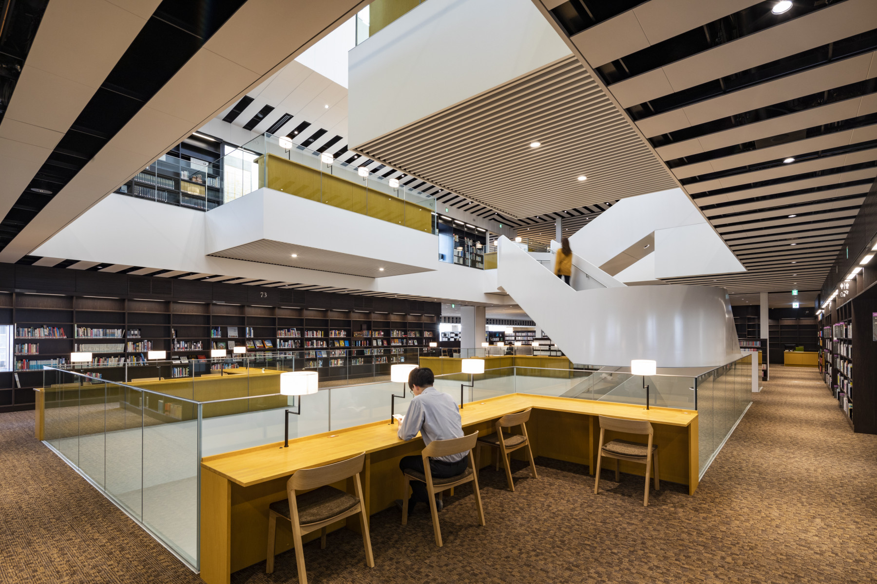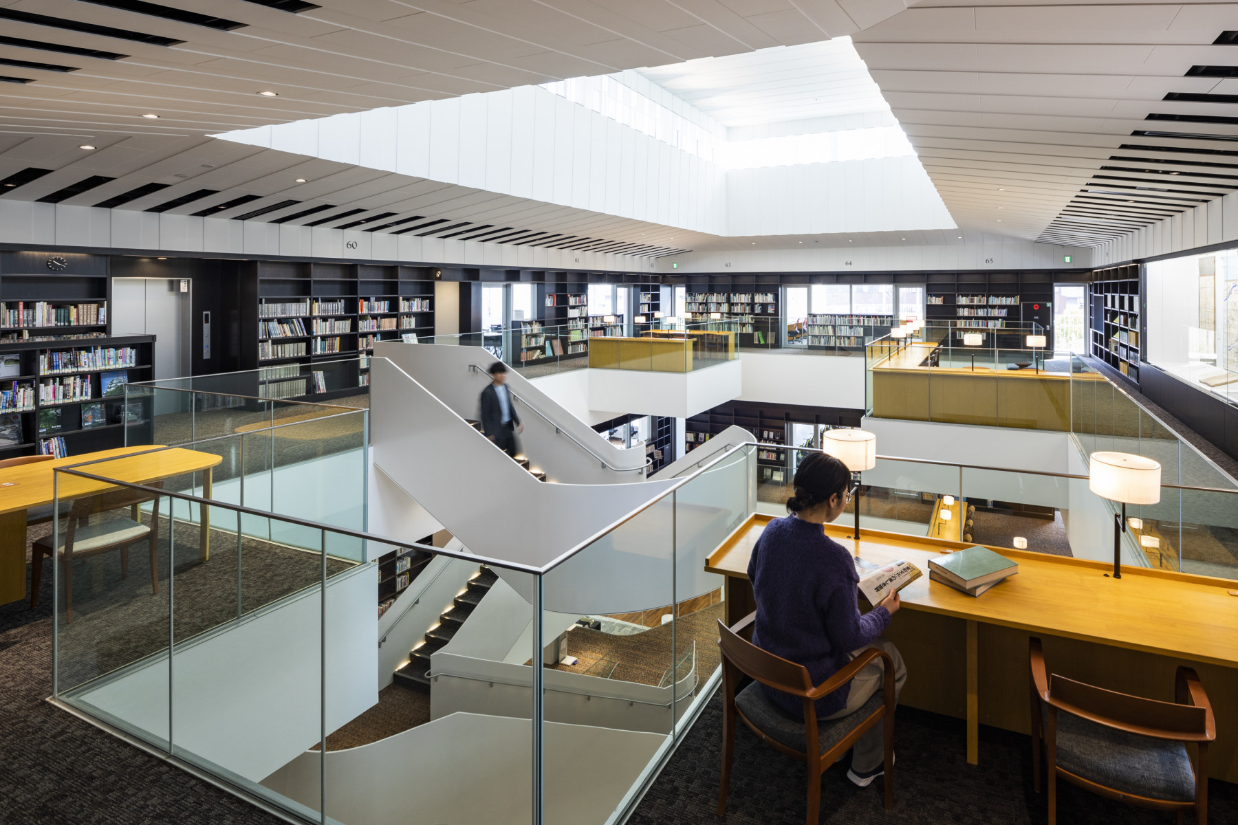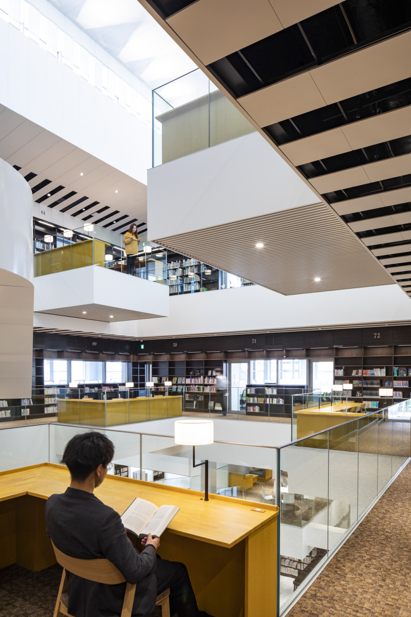 一見複雑な空間に感じるが、明快な構成とし各エリアにそれぞれの特性を与えることで、多様な居場所を創出しながらも、図書館としての機能性を確保している。この図書館は見る角度や方向によって多様な視線の抜けが突如として現れ、複雑なシーンが連続する。本との出会いを楽しみながら散策できる場所となっている。ハイサイドライトからの自然光に満たされた吹抜から見下ろすと、館内の約700の席で各々が自由に過ごす様子が、同時多発的に垣間見え、実に多様性に富んだ居場所となっている。またBDSのセキュリティラインを最大限に拡張し、バルコニーテラスも含めて館内全域に本を持ち出せるのも特徴である。