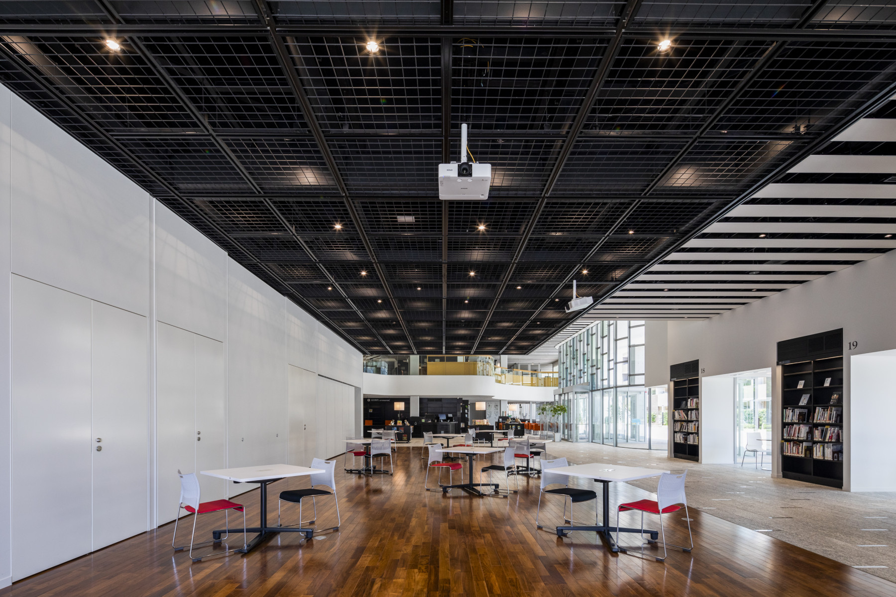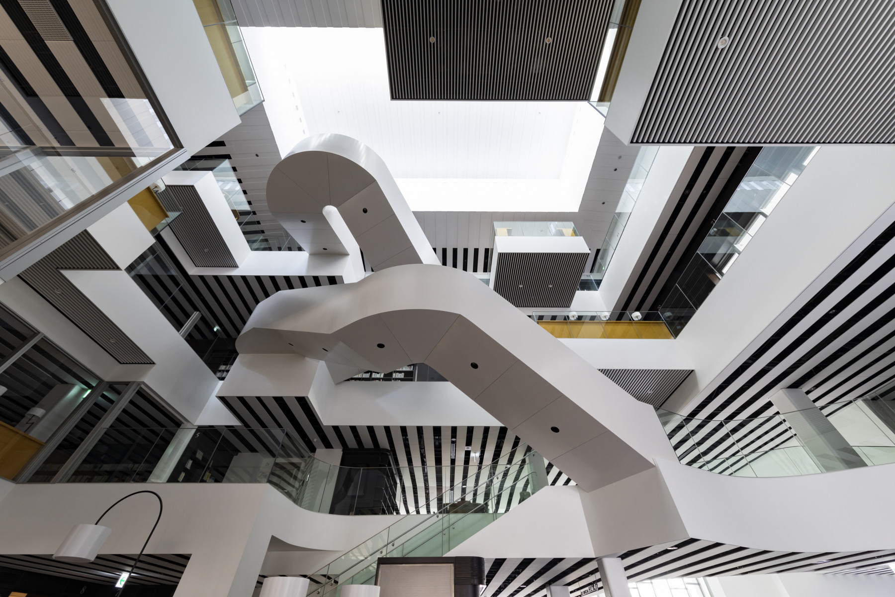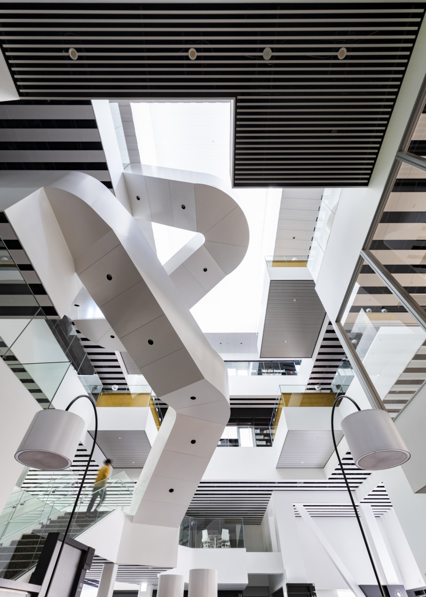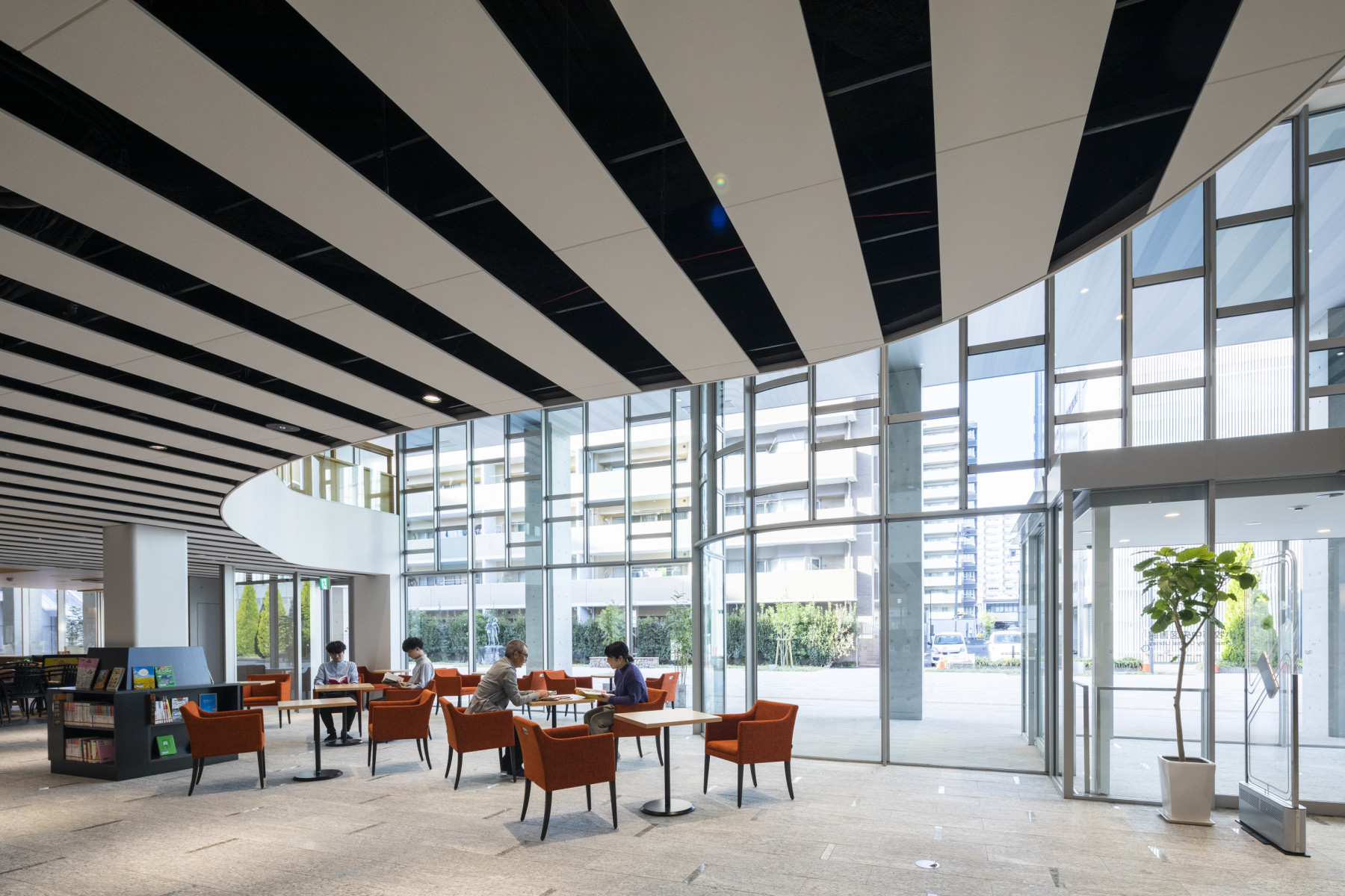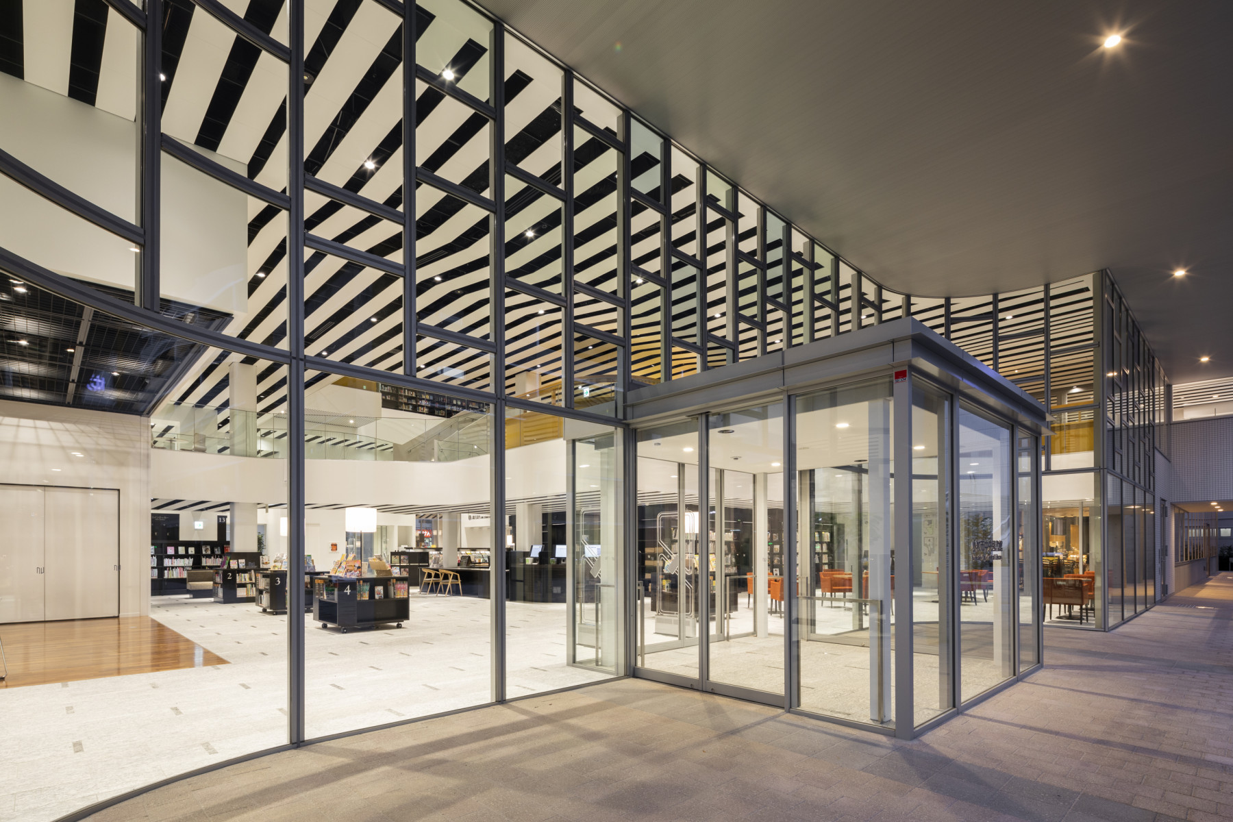 一見複雑な空間に感じるが、明快な構成とし各エリアにそれぞれの特性を与えることで、多様な居場所を創出しながらも、図書館としての機能性を確保している。この図書館は見る角度や方向によって多様な視線の抜けが突如として現れ、複雑なシーンが連続する。本との出会いを楽しみながら散策できる場所となっている。ハイサイドライトからの自然光に満たされた吹抜から見下ろすと、館内の約700の席で各々が自由に過ごす様子が、同時多発的に垣間見え、実に多様性に富んだ居場所となっている。またBDSのセキュリティラインを最大限に拡張し、バルコニーテラスも含めて館内全域に本を持ち出せるのも特徴である。